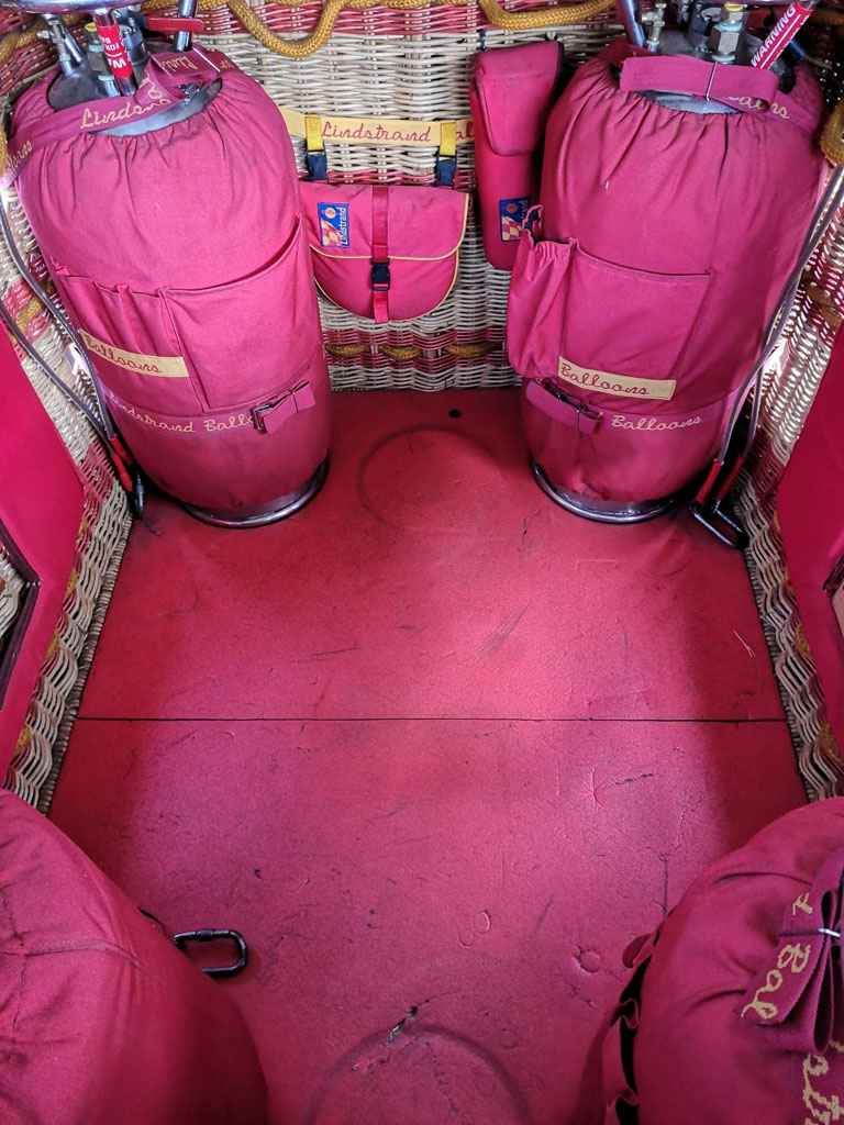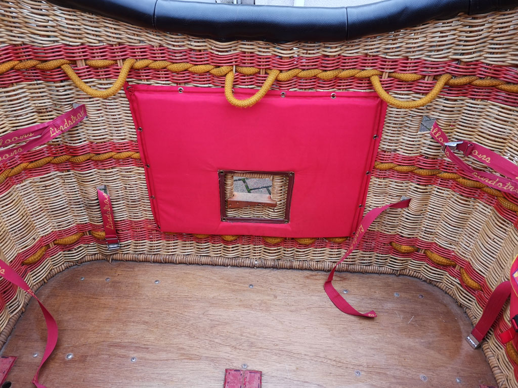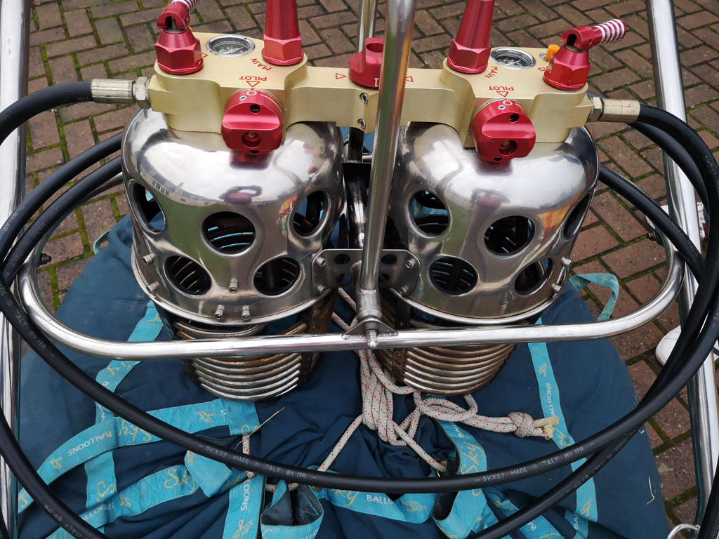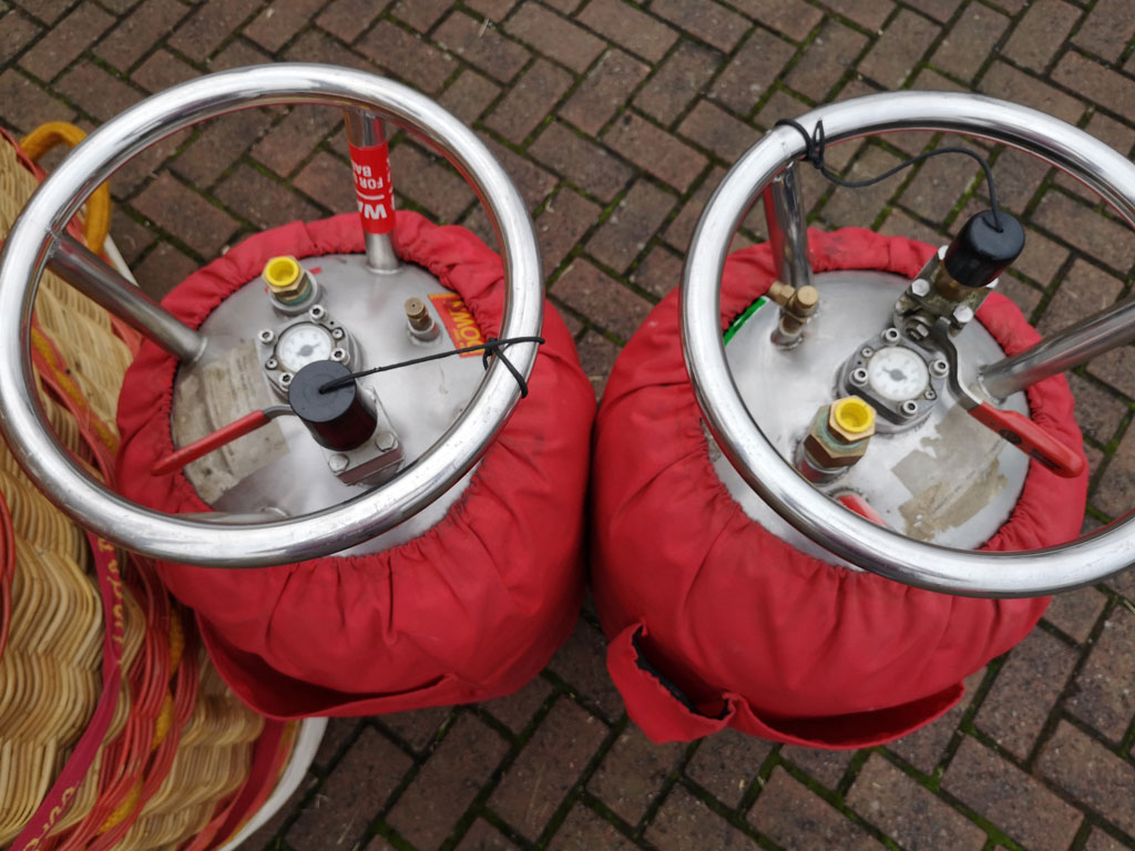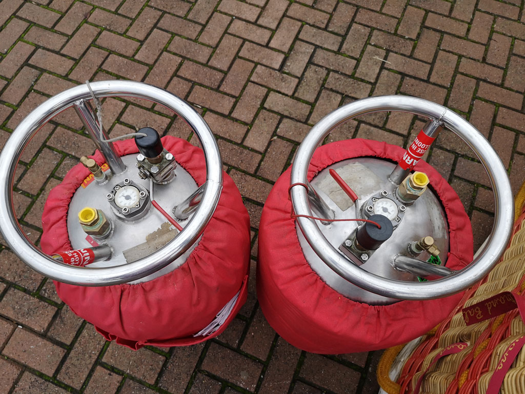 Lindstrand LBL open basket, built 1996, 263 hrs. Black leather top rim, sidewall padding, cushion floor, fire extinguisher, drop line. 1.65m x 1.22m. Lindstrand LBL Jetstream double burner, built 1996, 248 hrs. Liquid pilot lights, REGO fittings, burner bag. 3x Thunder & Colt V30 cylinders, 1x Lindstrand V30 cylinder. All slave, REGO, Quick Shut Off valves, red cover, PRV/PPT/INT valid until 08/2024. 2x 2-tank manifold.