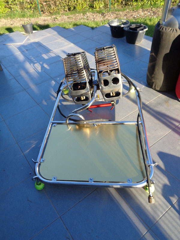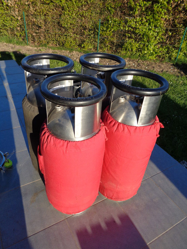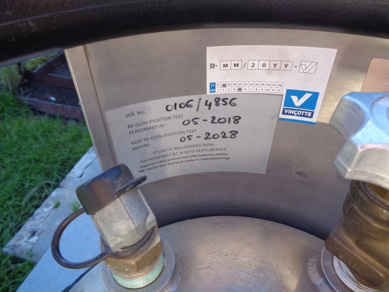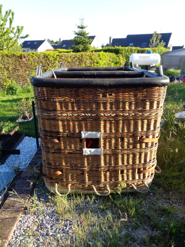 Cameron 120P (CB3238C) basket, built 1996, black leather top rim, sidewall padding, cushion floor. Fire extinguisher, drop line, various bags. Cameron Stealth/Shadow double burner (CB2243-2A), built 1996, liquid pilot lights, REGO fittings. In height adjustable frame (CB2469). Hoses installed 06/2018. 4x Cameron CB599 cylinders, built 1995, slave. Usable volume 42 liter. Slave, REGO fitting. 2x black cover, 2x red cover. New FLL gauges installed 06/2018. PRV valid until 08/2027. PPT/INT valid until 05/2028. Honda 8.0 HP inflation fan, stainless steel flip wheel frame, wooden propeller. All in good condition. Last inspected 06/2018, EASA Form 1 will be provided.
