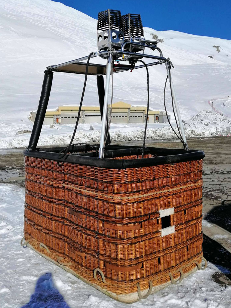 Cameron 120P (CB3238C) basket, built 1996, black leather top rim, sidewall padding, cushion floor. Fire extinguisher, drop line, various bags. Cameron Stealth/Shadow double burner (CB2243-2A), built 1996, liquid pilot lights, REGO fittings. In height adjustable frame (CB2469). Hoses installed 06/2018. All in good condition. Last inspected 06/2018, EASA Form 1 will be provided.