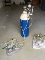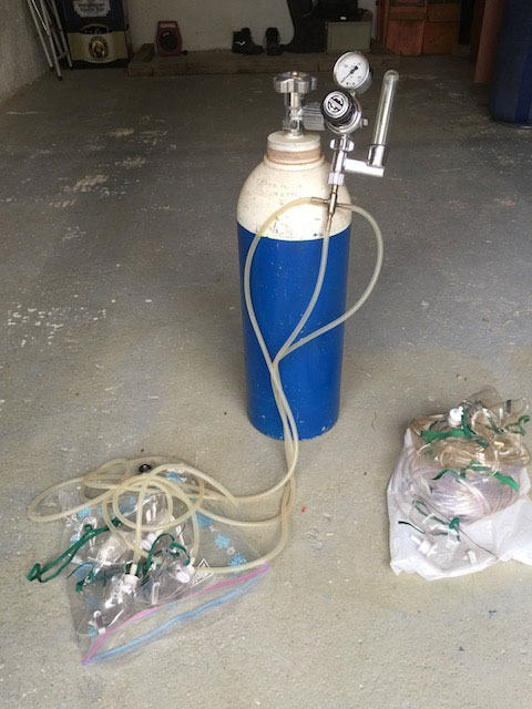 Oxygen kit consisting of a 5 liter cylinder, pressure reducer, attachment for 3 oxygen masks, 7 oxygen masks.