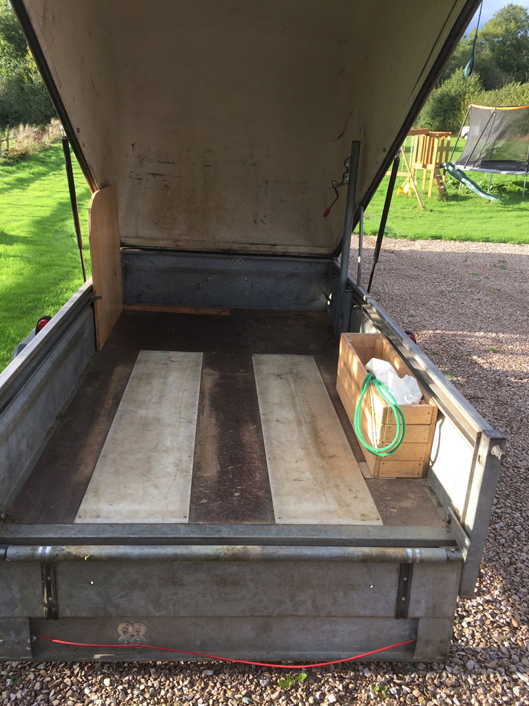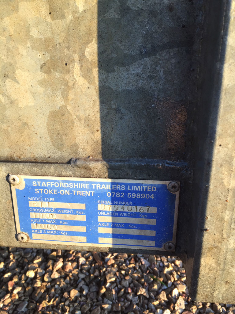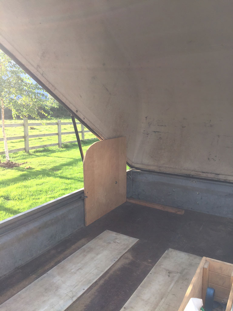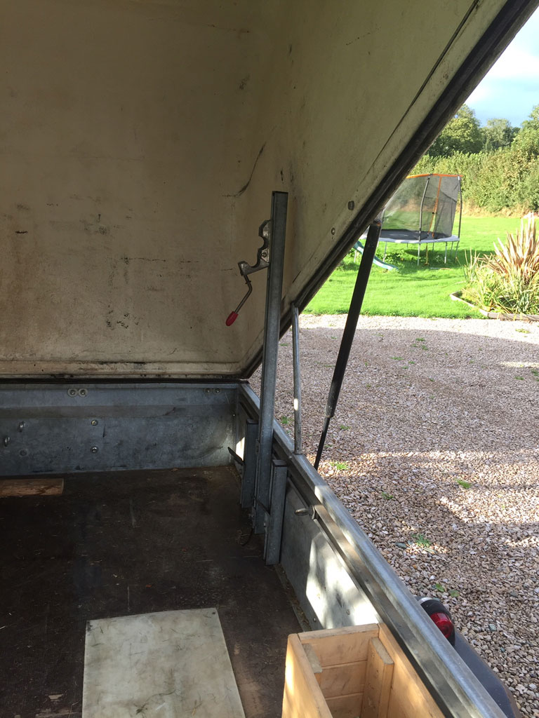 2.5m single axle Staffordshire trailer, built 2002, inside length 2.5m. Max load 1000 kg. Solid clean floor, perspex runners, fan mount. 3 good tyres, rear clamps repaired/replaced and fully lockable. Bradley tow hitch with lock. New gas struts. Storage box which can be easily removed. Very tidy condition all around.