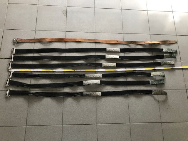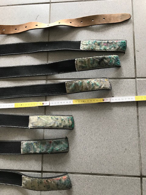 Raven cylinder straps, 3x 1.50m, 3x 1.65m. 1x leather belt, 1.70m.