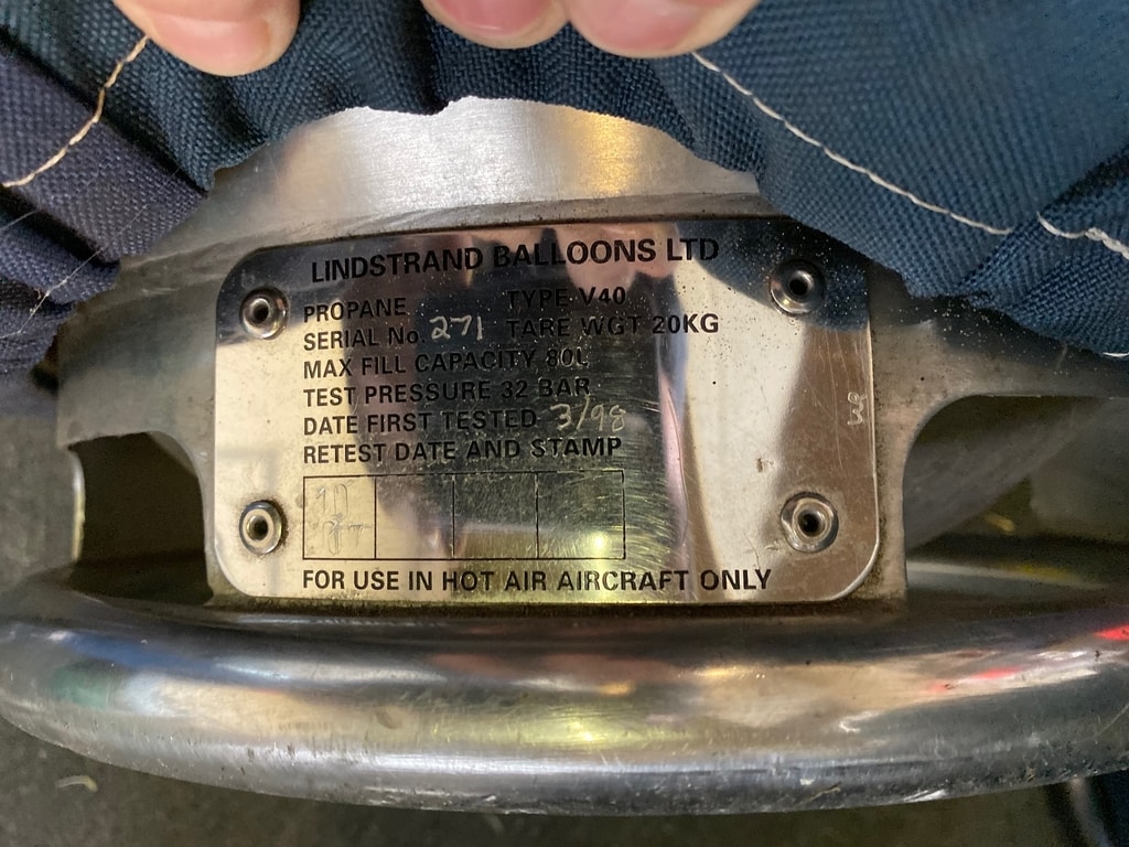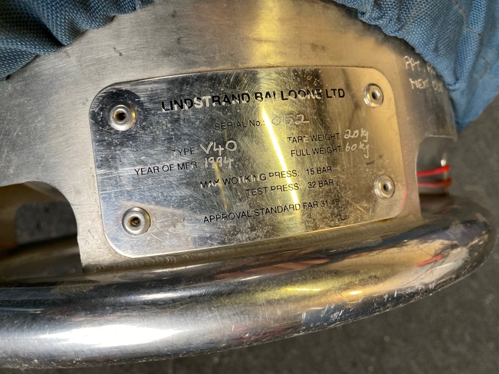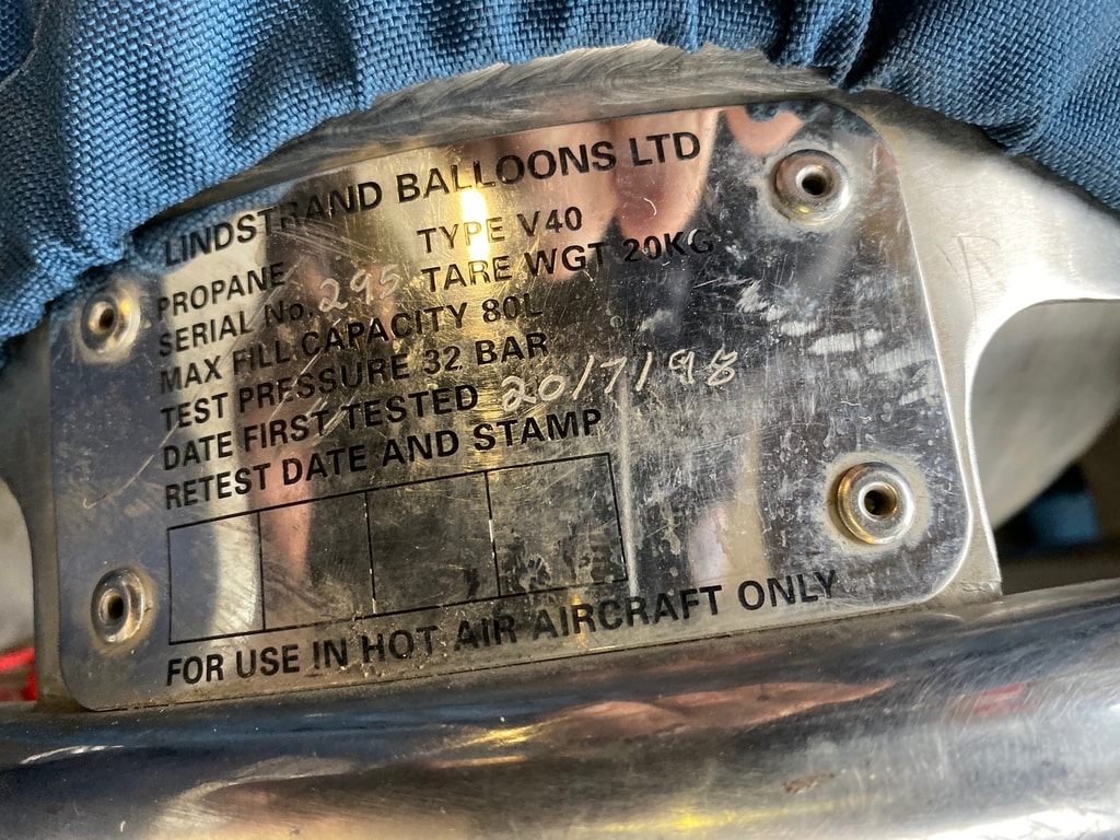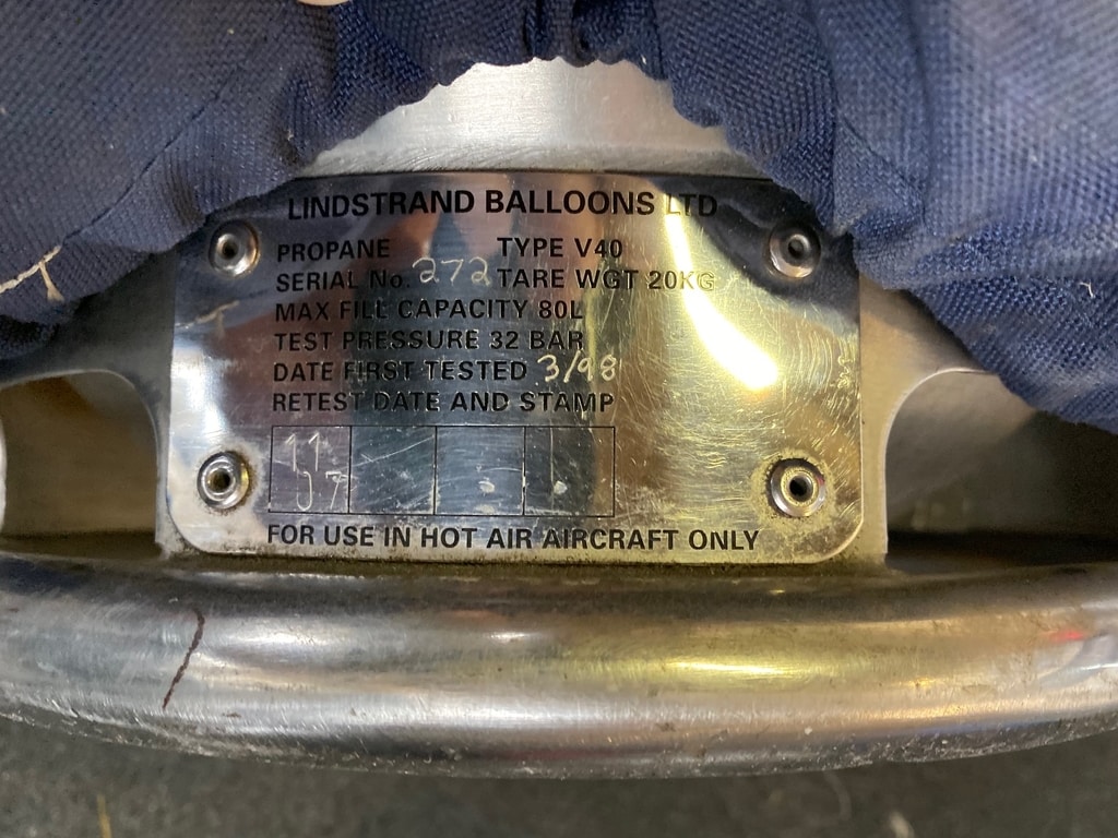 4x Lindstrand LBL V40 cylinders, built 1x 1994 / 3x 1998. Slave, quick shut off valve, REGO fitting, blue cover. PRV/PPT/INT valid until 11/2029. Comes with EASA Form 1.