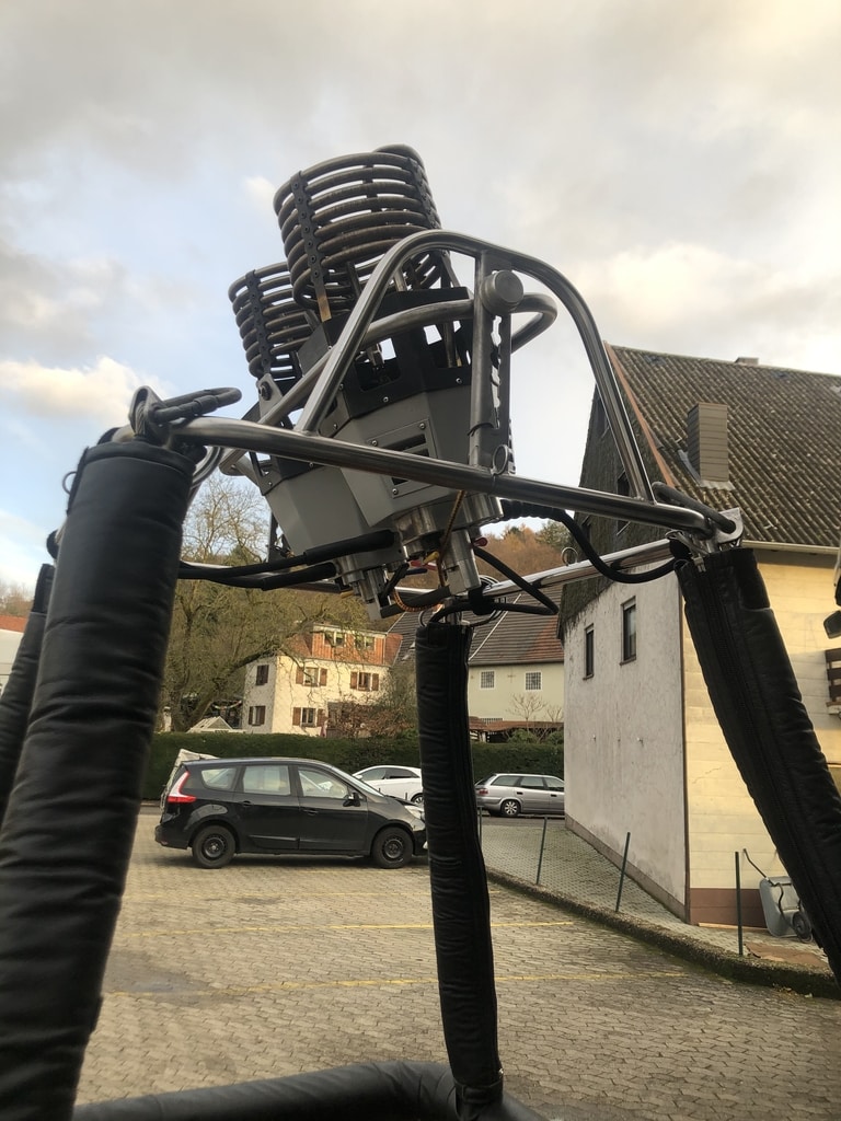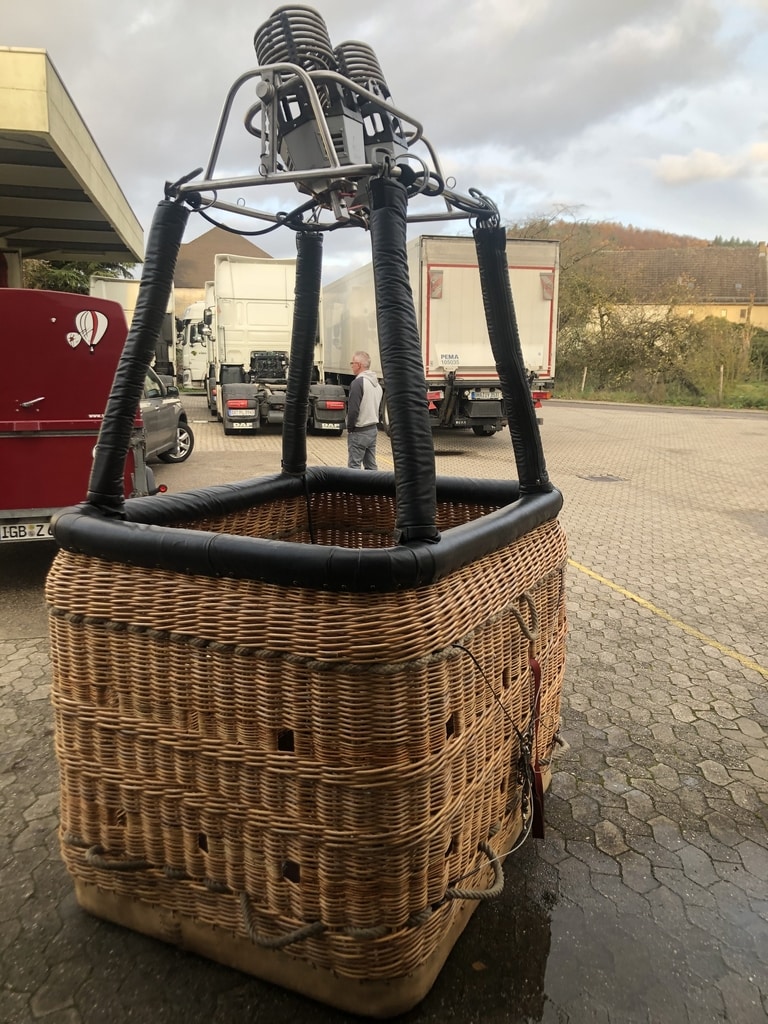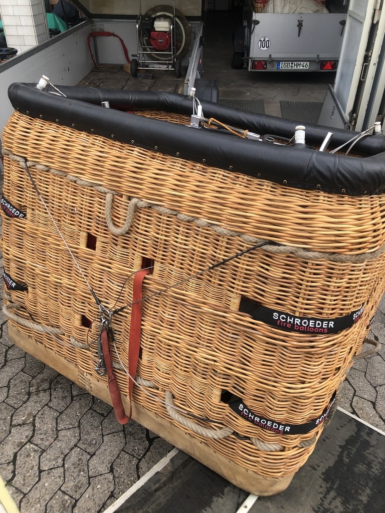 Schroeder V basket, built 2002, 350 flights, 380 hrs. Outside dimensions 1.55m x 1.20m. Black leather top rim, cushion floor, drop line, first aid bag, fire extinguisher mount, radio bag, quick release (no rope included). Schroeder FB6 double burner, built 2002, 350 flights, 380 hrs. Vapour pilot lights, hosed dated 08/2012, TEMA fittings.