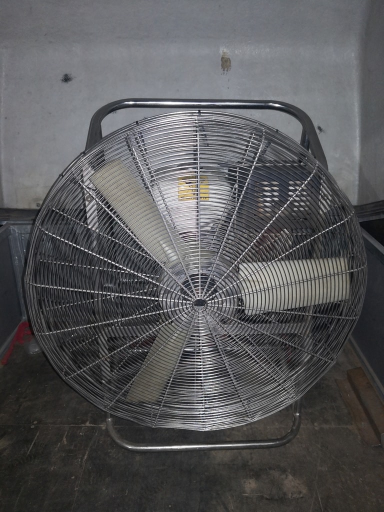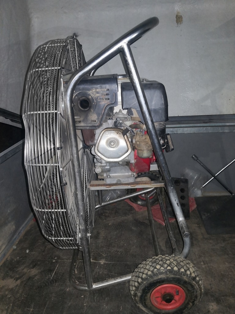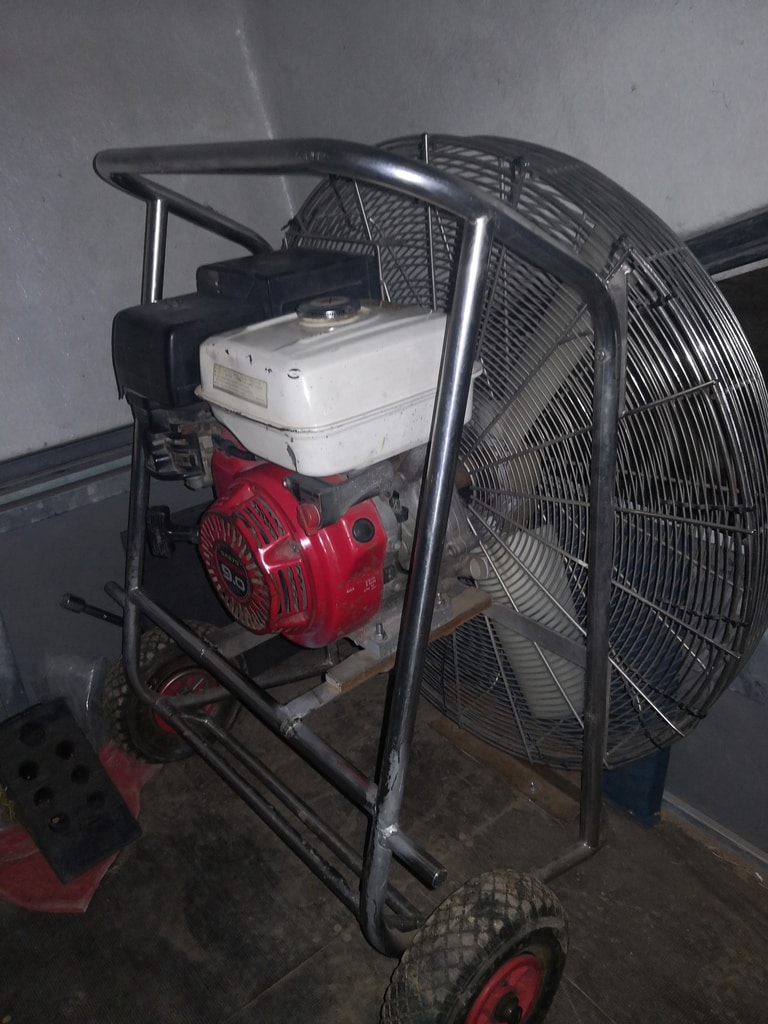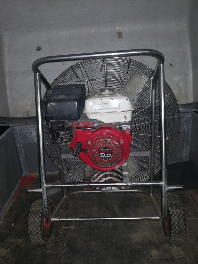 9.0 HP inflation fan, stainless steel flip wheel frame, plastic tri-blade propeller. Works perfectly, only needs new inner tube on wheels.