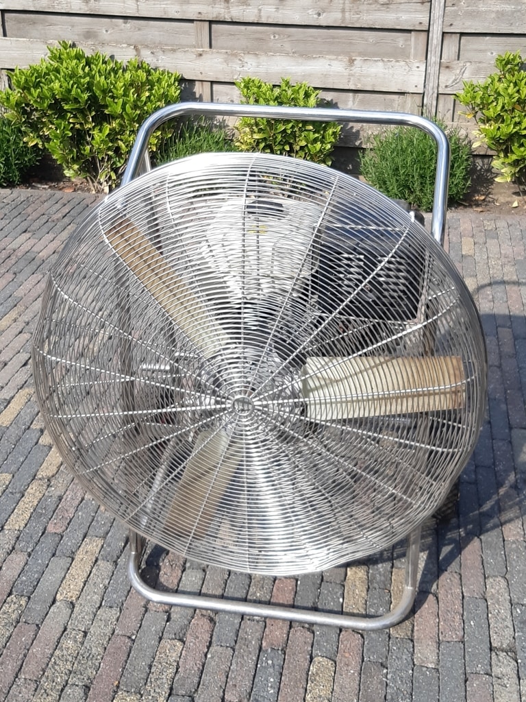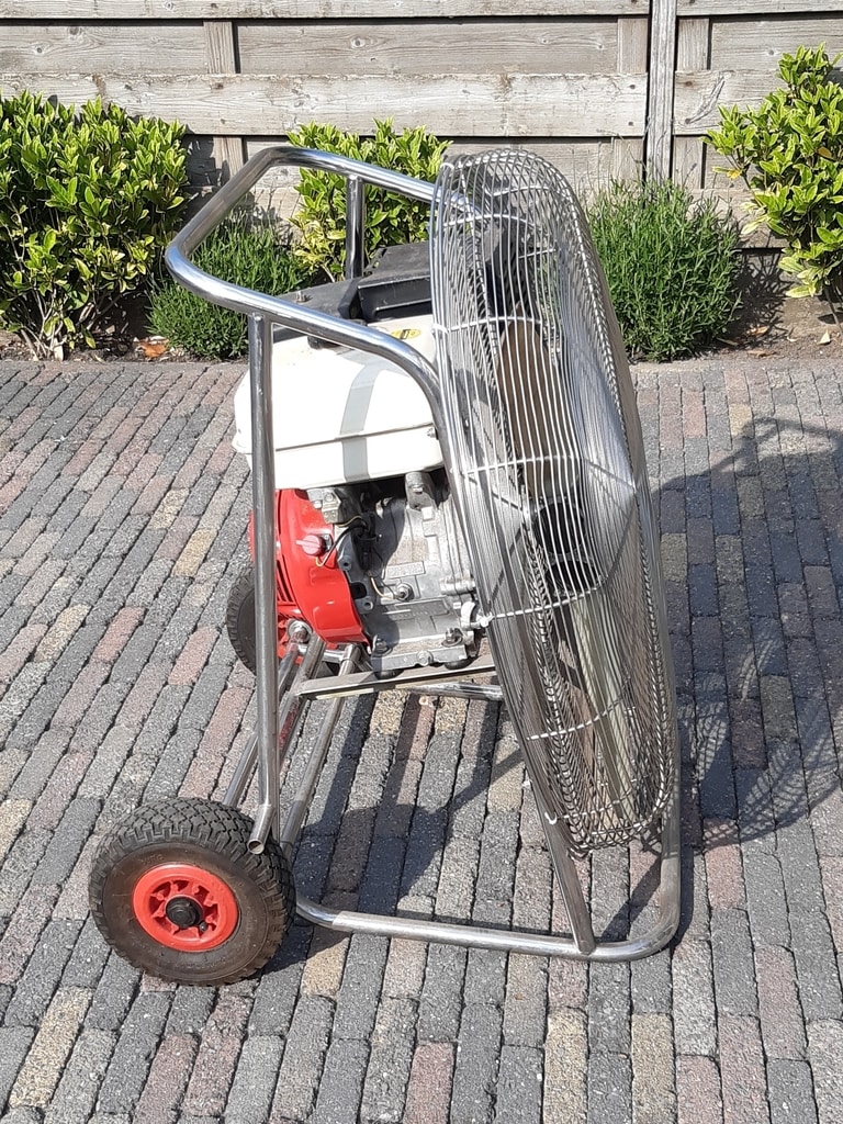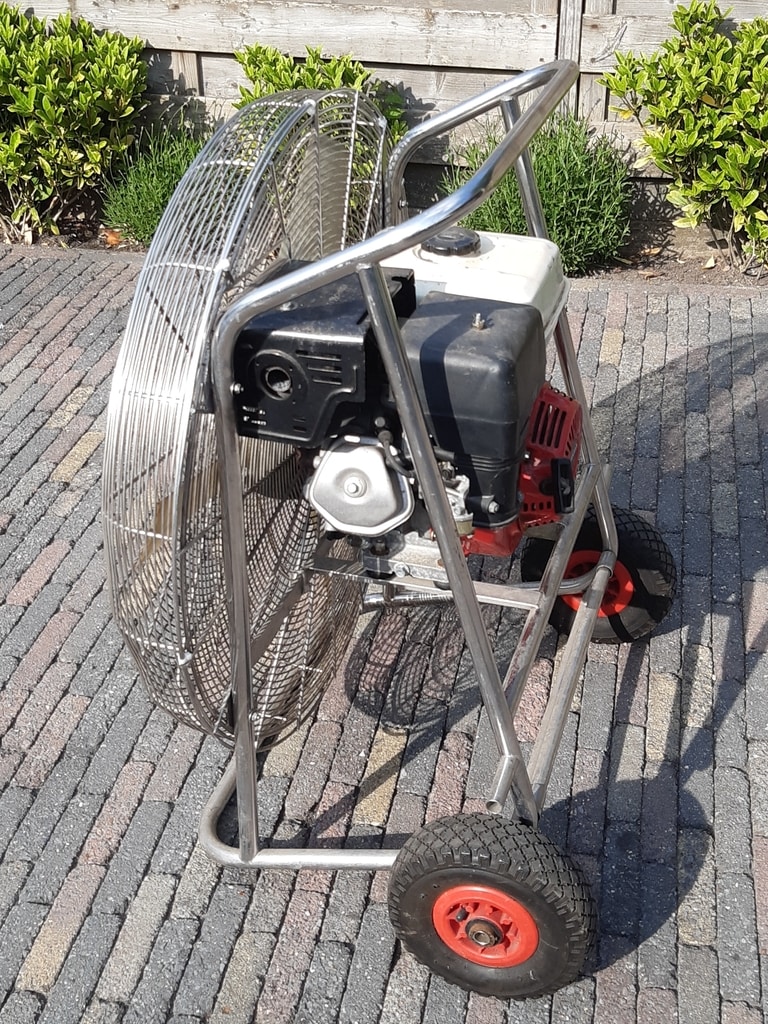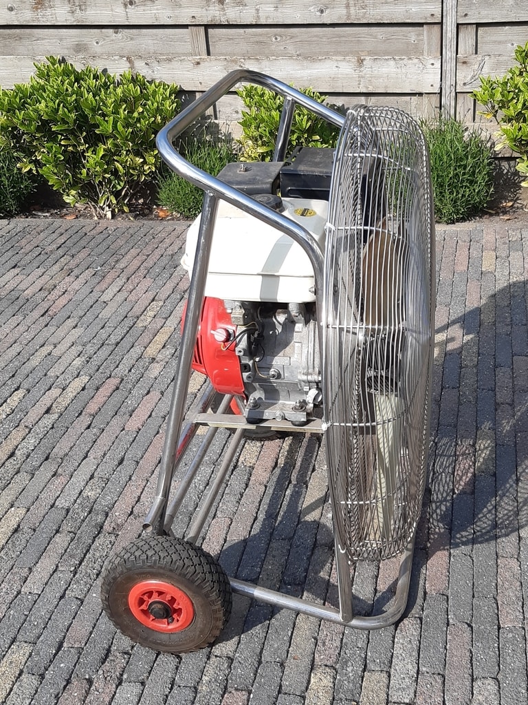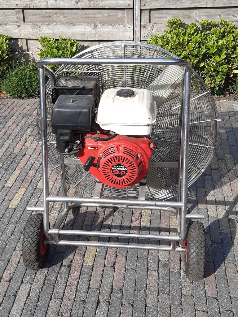 9.0 HP inflation fan, stainless steel flip wheel frame, tri-blade plastic propeller. In good condition.