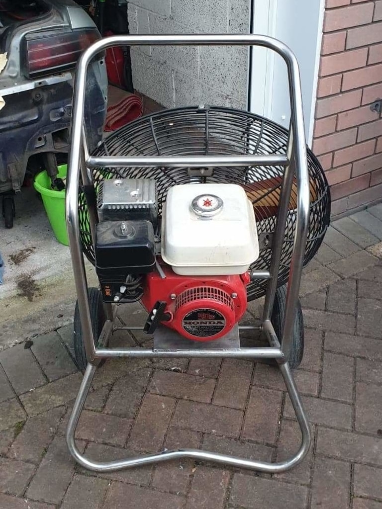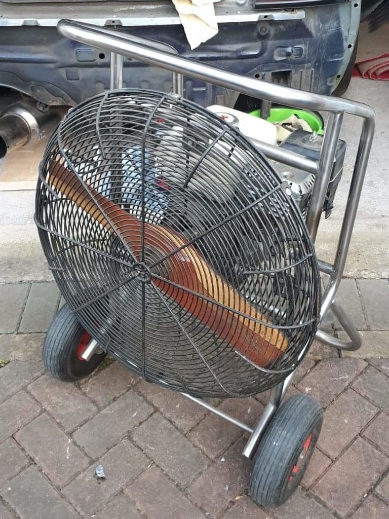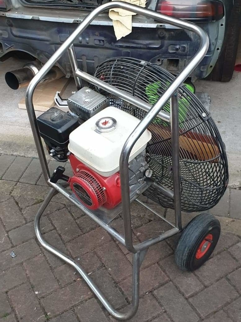 5.0 HP inflation fan, stainless steel frame with fixed axle. Wooden propeller. Recently serviced, in good working order.