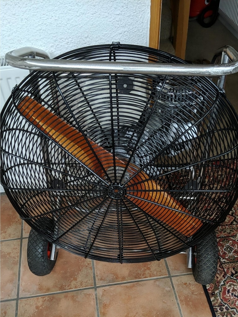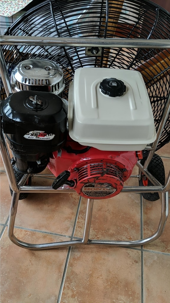 8.0 HP inflation fan, stainless steel frame with fixed axle. New wooden propeller, new fuel tank, fully serviced. Starts at first pull and works as it should.