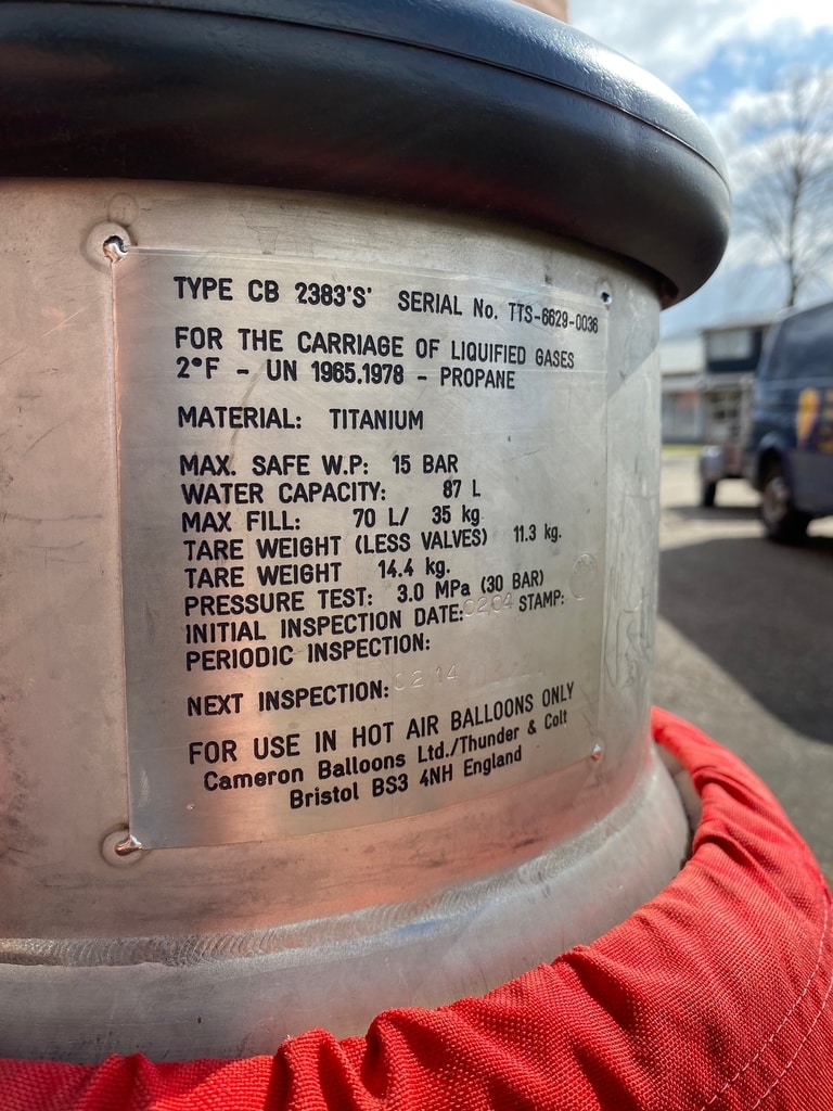 2x Cameron CB2383S Titanium cylinder, built 2004, usable volume 70 liter. Quick shut off valve, REGO fitting, red cover. PRV/PPT/INT valid until 04/2031. Comes with EASA Form 1.