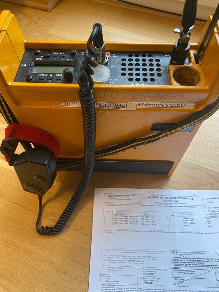 Dittel KRT2 in carrying case. 8.33 kHz channel spacing, 100 named memory slots. Radio built 2014, new battery in 2014. Comes with original Form 1 and invoice. Usual signs of use but in fully functional condition.