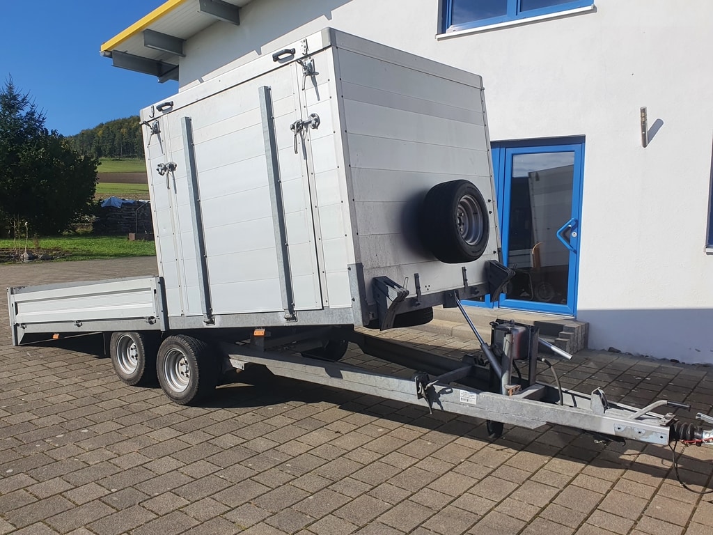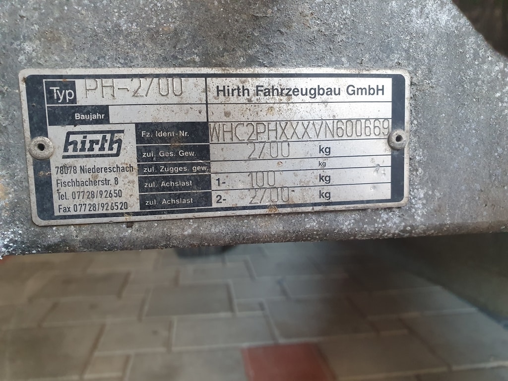 4.7m tandem axle Hirth trailer, built 1997, dimensions 2.75m x 1.9m, housing dimensions 1.9m x 1.9m x 1.6m). Max total weight 2700 kg, recently serviced, always stored indoors.