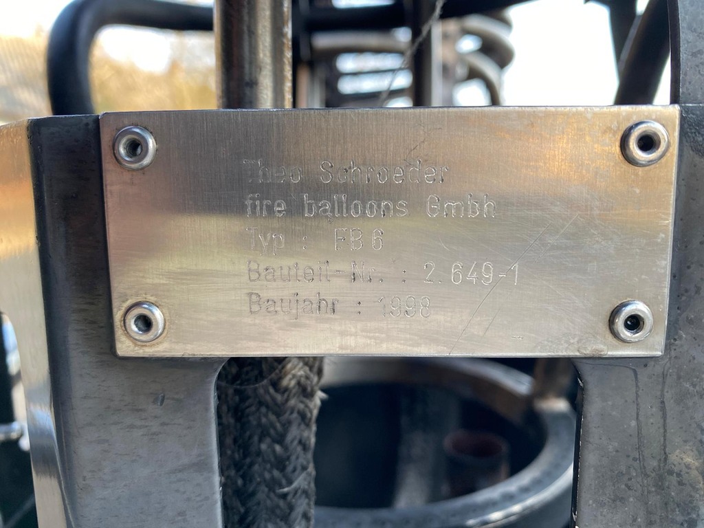 SP-BSD, Schroeder Fire Balloons G 42/24, built 2005, 305 hrs. 4.250 m3 / 150.000 ft3. Hyperlast top (parachute + 4 rows), smart vent, turning vents. Always flown with maximum 5 passengers. Schroeder VI open basket, built 1998, 580 hrs. Outside dimensions 1.75m x 1.23m. Red leather top rim. Schroeder FB6 double burner, built 1998, 580 hrs. Vapour pilot lights, REGO fittings, hoses dated 07/2017. 4x Worthington cylinder optionally available. Will split. Will be sold with new ARC.