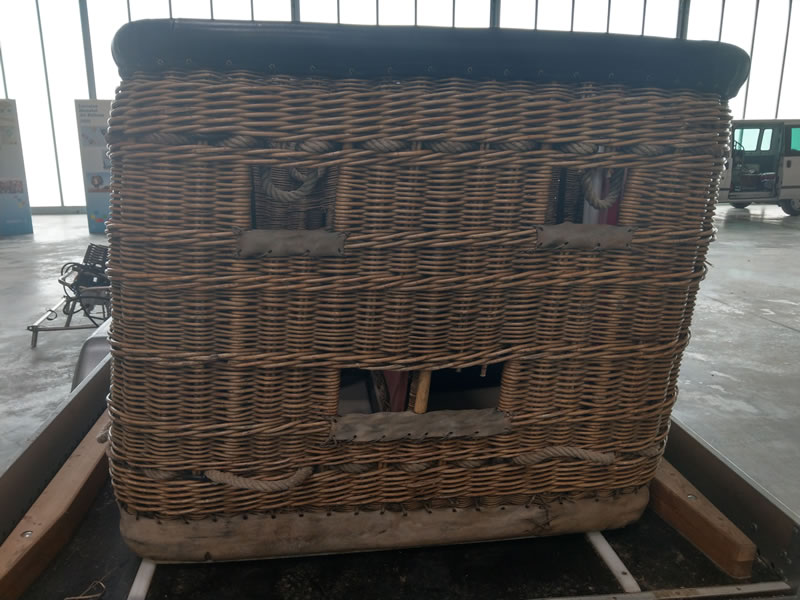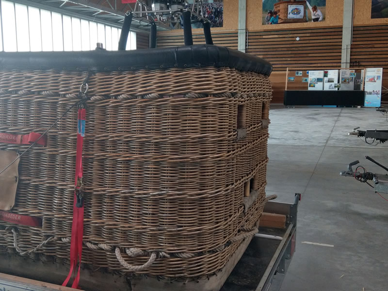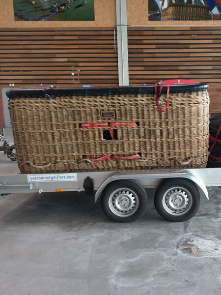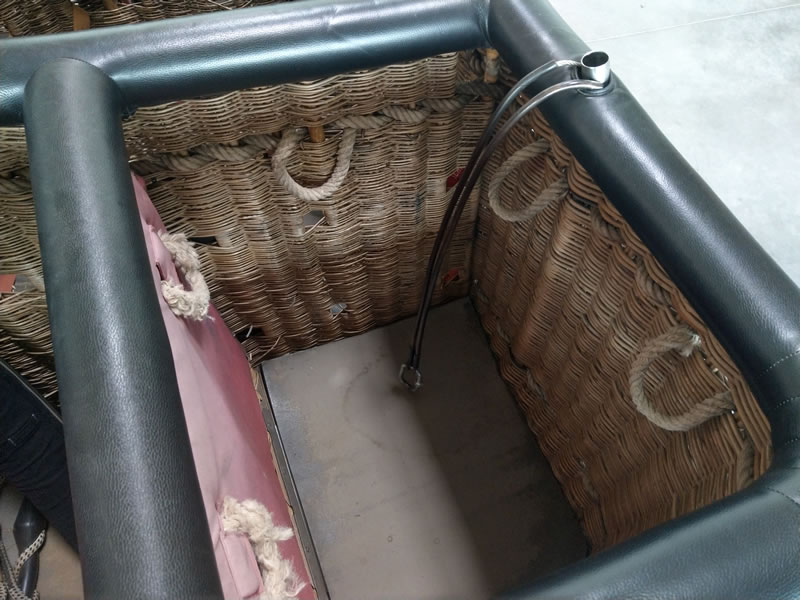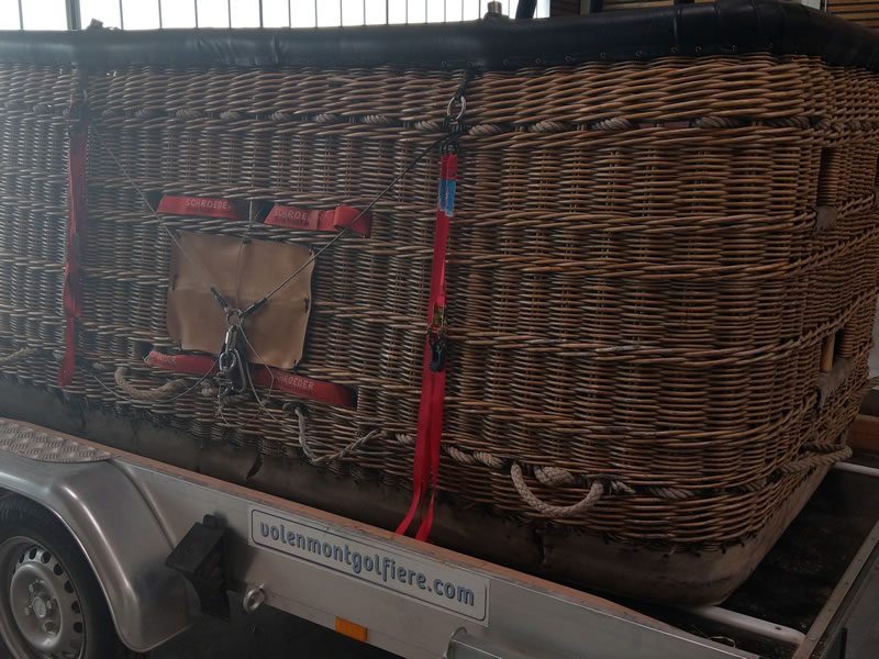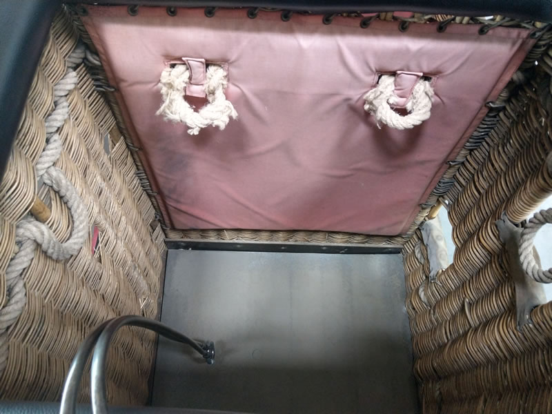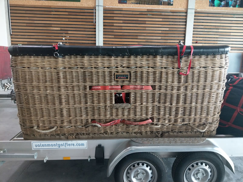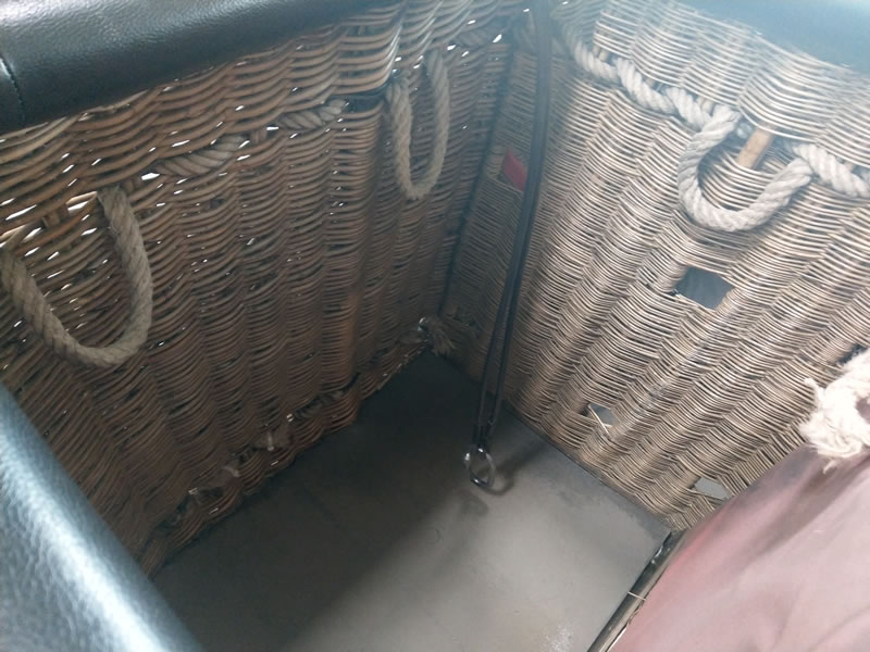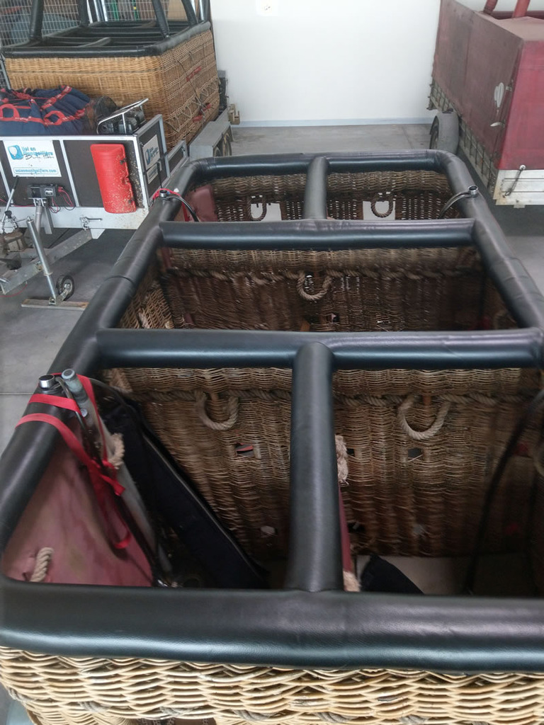 Schroeder VIII/9 double T basket, outside dimensions 2.60m x 1.45m. Black leather top rim, sidewall padding, cushion floor. Quick release. Old, but in flying condition. Immediately available.