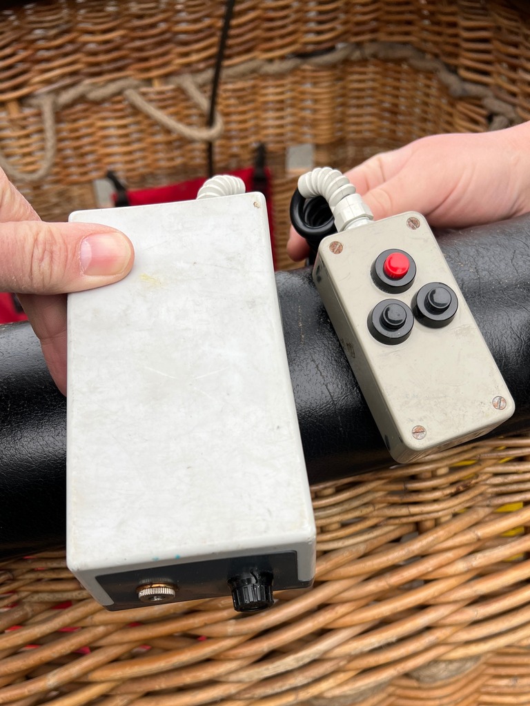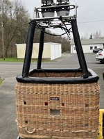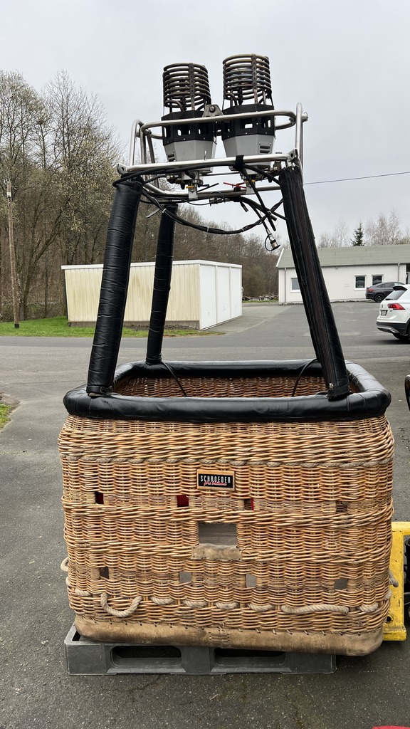 Schroeder IV basket, built 1999, black leather top rim, cushion floor, drop line. Schroeder FB6 double burner, built 1999, vapour pilot lights, TEMA fittings, hoses dated 01/2016. In height adjustable frame, with remote control.