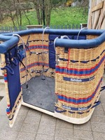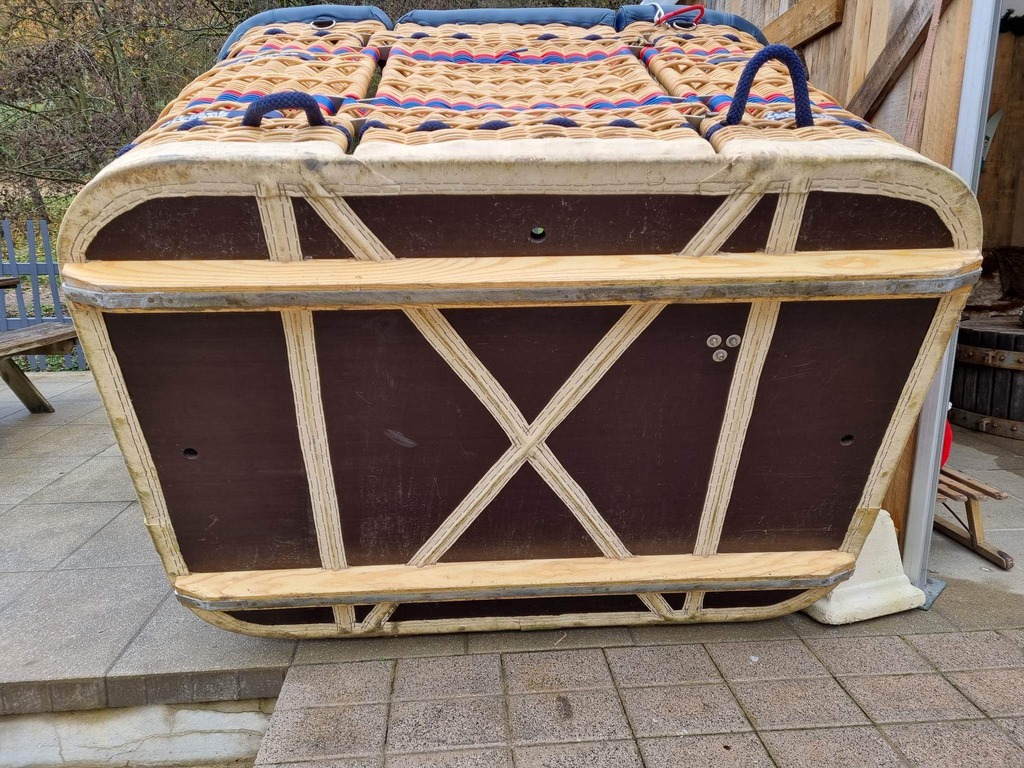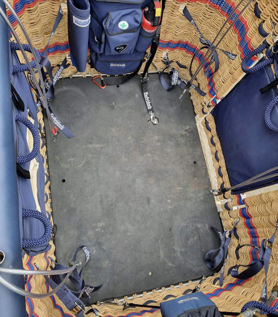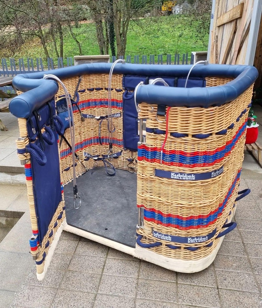 Kubicek K19 basket with door, built 2020, approximately 30 hrs. Outside dimensions 1.55m x 1.16m. Blue leather top rim, sidewall padding, cushion floor, drop line, first aid kit, fire extinguisher, various bags, pilot restraint harness, side skids on one side. Immediately available.