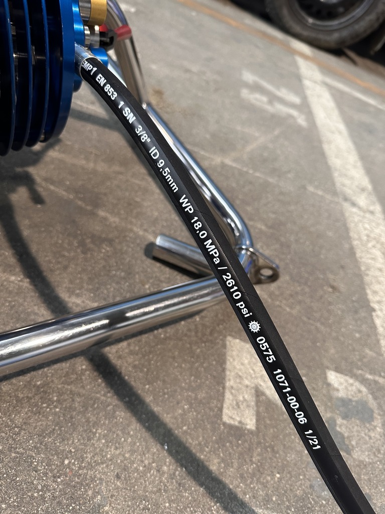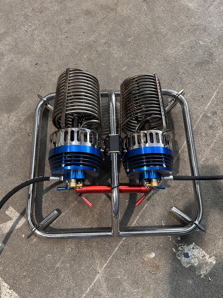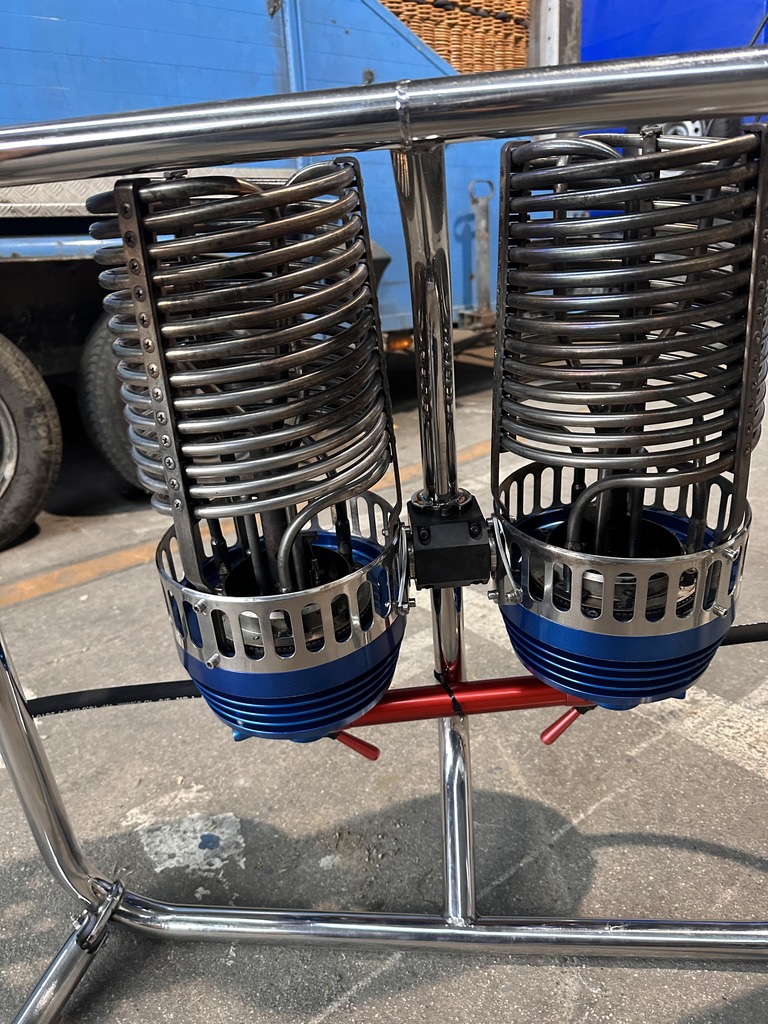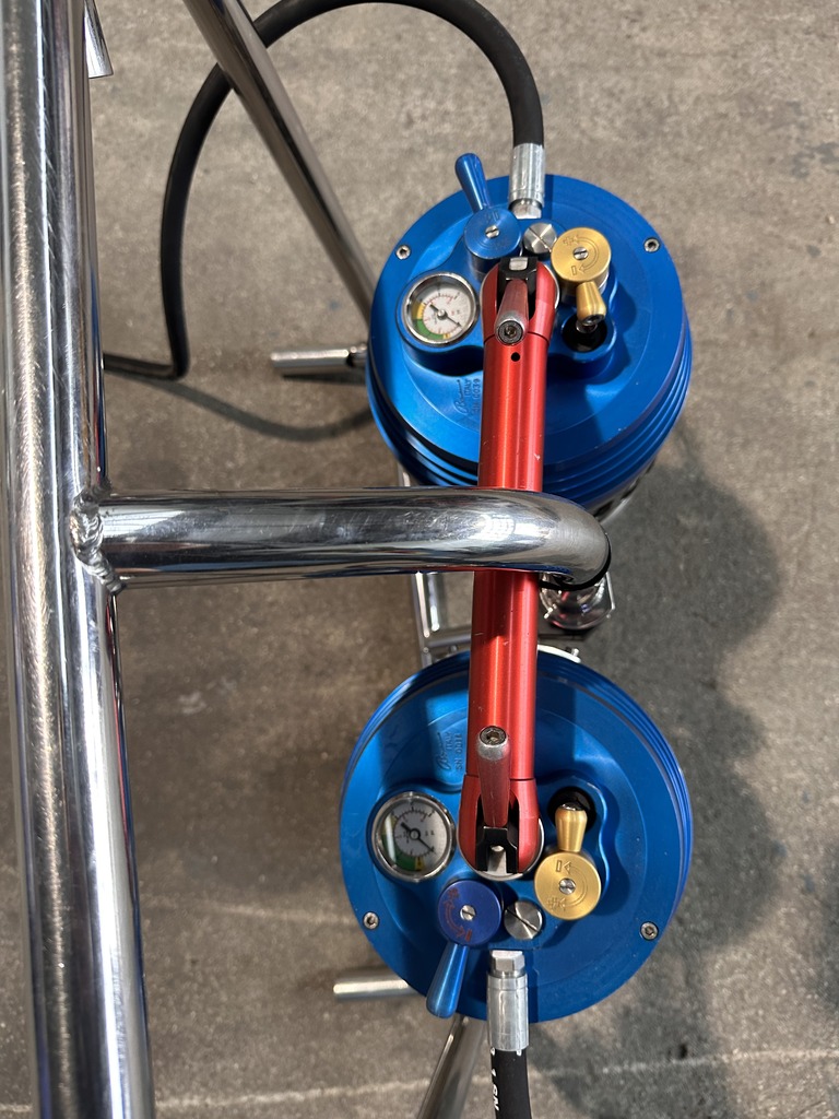 Cameron Sirocco double burner (CB2698), built 1999, in CB2203-3 standard gimbal block frame with flexible corners. Liquid pilot lights, REGO fittings, hoses dated 01/2021. New REGO fittings and major maintenance in 01/2023.