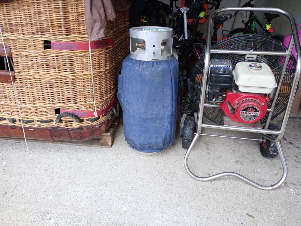 OM-3333, Kubicek BB26N, built 2006, 800 flights, 840 hrs. 2.600 m3 / 90.000 ft3. Top rows replaced in 2022, 180 hrs since, parachute replaced in 2023, 95 hrs since. Kubicek K12 basket, built 2006, 800 flights, 840 hrs. Inside dimensions 1.16m x 1.16m. Black suede top rim, cushion floor, fire extinguisher, drop line. Kubicek Komet Duo burner, built 2006, 800 flights, 840 hrs. Vapour pilot lights, REGO fittings, hoses dated 1/2015. 1x Worthington cylinder, built 11/1979, master, REGO fitting, blue cover. PRV/PPT/INT valid until 2029. 5.0 HP inflation fan, stainless steel frame with fixed axle, wooden propeller. Agados single axle trailer, built 2006, inside dimensions 2.05m x 1.25m, with mount for inflation fan, max total weight 750 kg. 3-ring quick release, LPG refueling hose. Artwork can stay. ARC valid until 29/05/2024.
