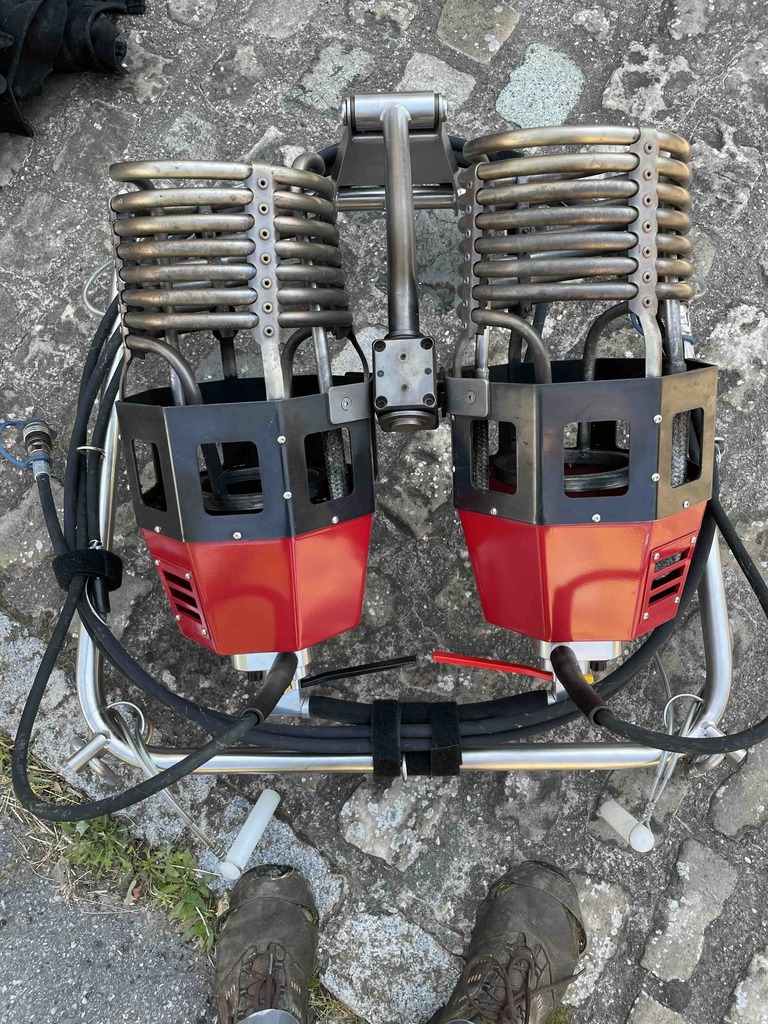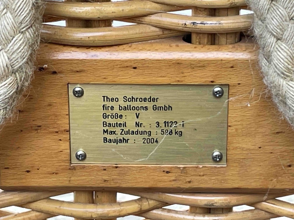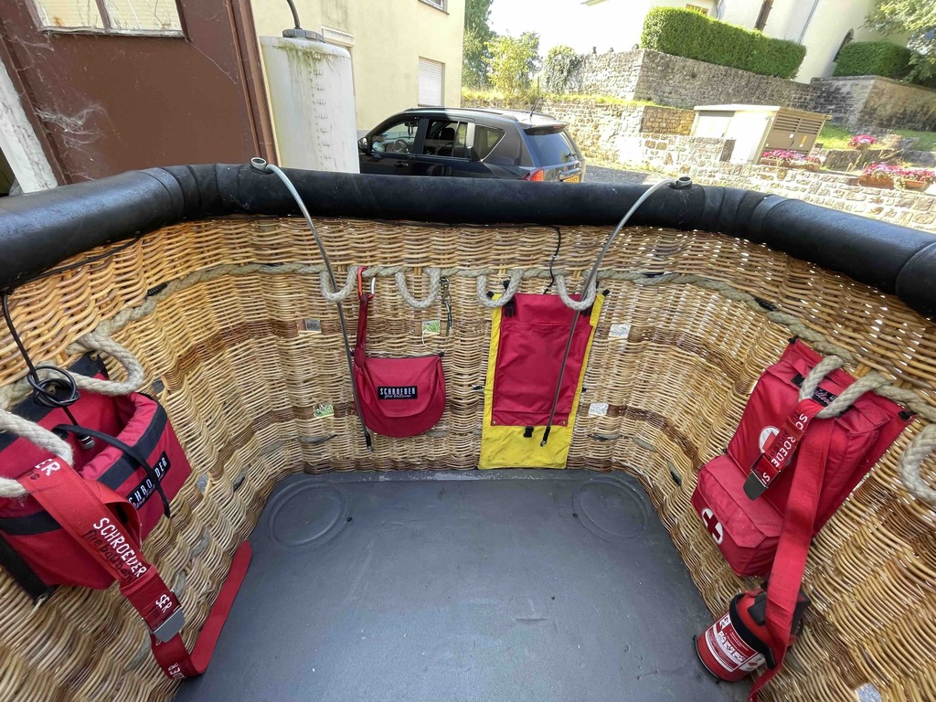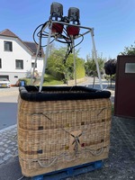 Schroeder V basket, built 2004. Black suede top rim, cushion floor, outside dimensions 1.5m x 1.15m. Drop line, fire blanket, Bonanno quick release, various ropes, antenna wiring and case for transponder/radio. Schoeder FB6 double burner, built 2004, vapour pilot lights, TEMA fittings, needs new hoses. In height adjustable frame. All In very good condition.