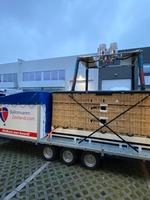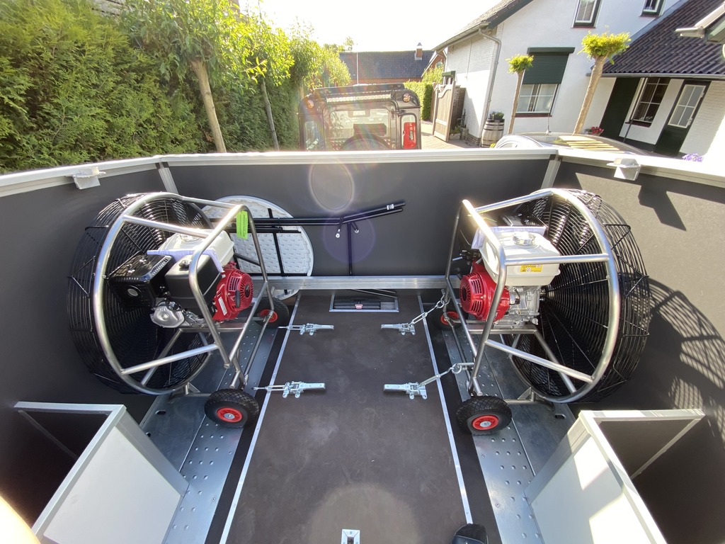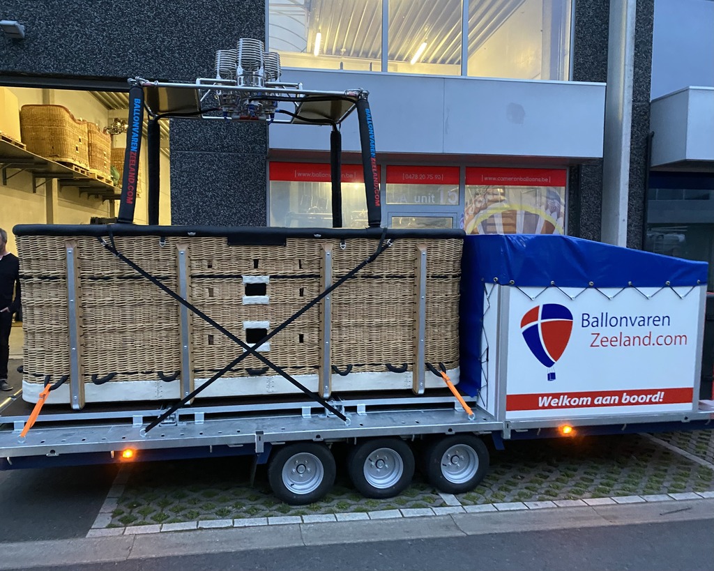 Brian James 5.5m Cargo Connect triple axle trailer, built 2022, max total weight 3500 kg. Tiltable platform (dimensions 5.5m x 2.25m) with hydraulic pump and winch with rope, powered by rechargeable battery. LED lighting, anti-theft lock integrated in the trailer coupling. Reinforced nose wheel and stainless steel box on front. Fire extinguisher. Used for Cameron Z-275 with CB3387 double T basket (with 20 cm of space left to eventually accommodate a larger basket). Wooden guidance railes for easy (un)loading and anchor points for fixing the basket on each side. Covered storage area for cylinders (for 1x 8.0 HP and 1x 13.0 HP) and 2 boxes for Alugas 40 liter cylinders. Tyres are in good condition. Immediately available.