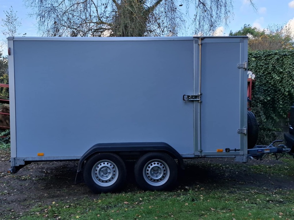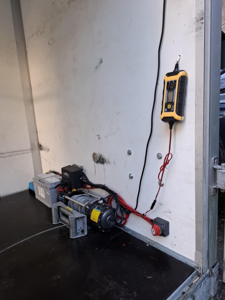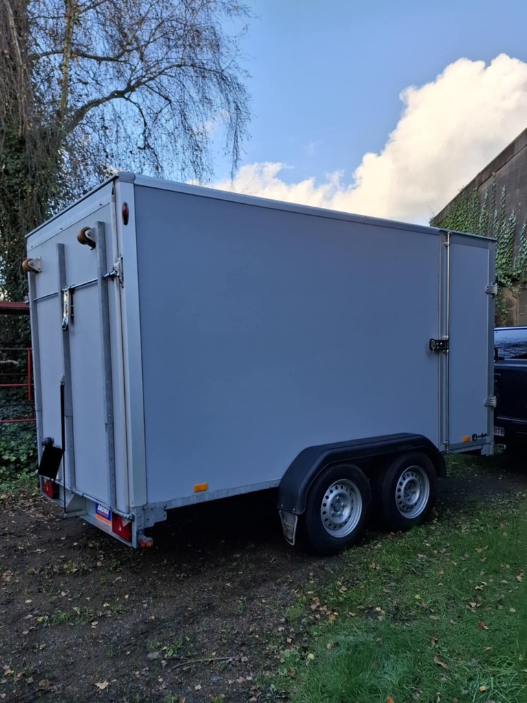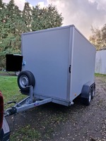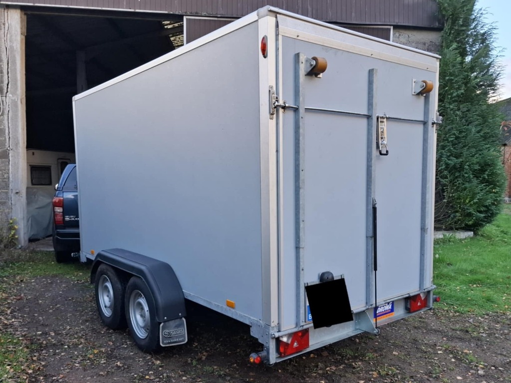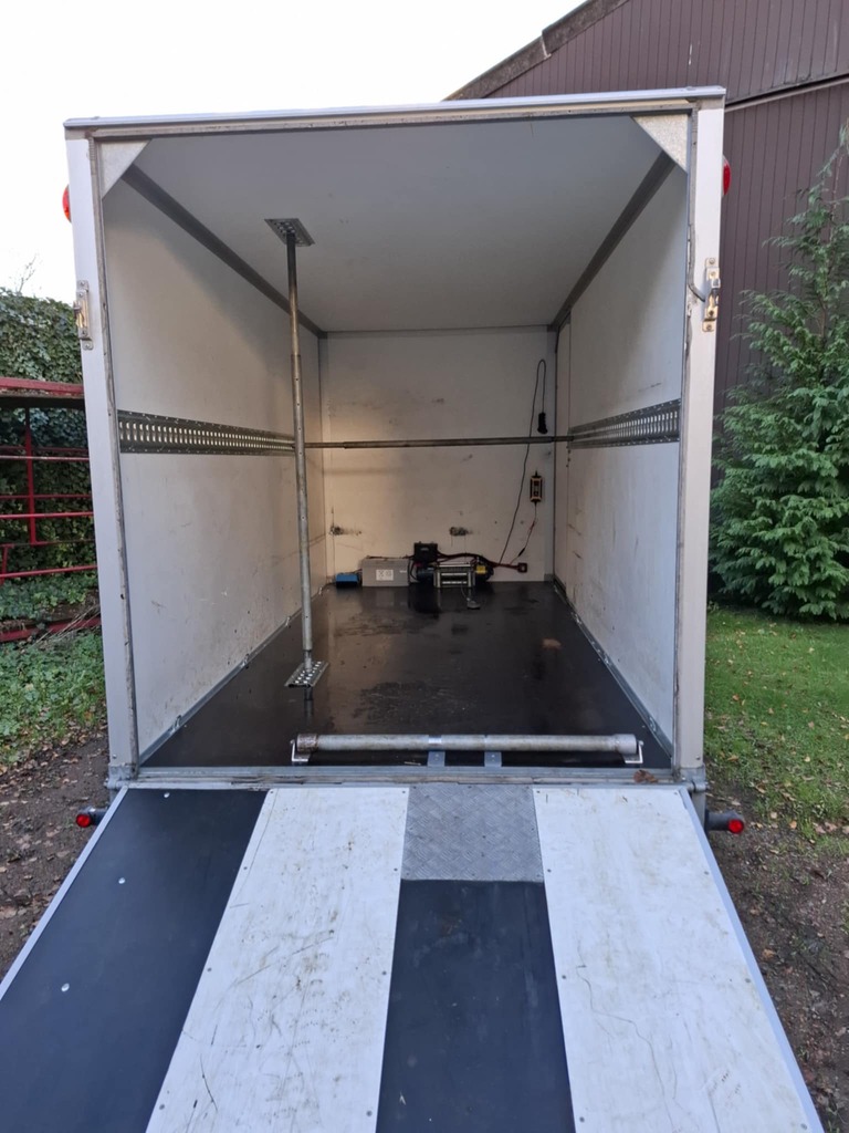 Saris 3m tandem axle GX2700 trailer, built 04/2022, inside dimensions 3.06m x 1.54m x 2.03m. Side door, ramp on back, winch, sliding plates on ramp, roller on ramp, cargo bar system to secure load. Battery for winch can be loaded by the car connection as well as separate 220V plug. Max total weight 2700 kg, max load 1999 kg.