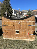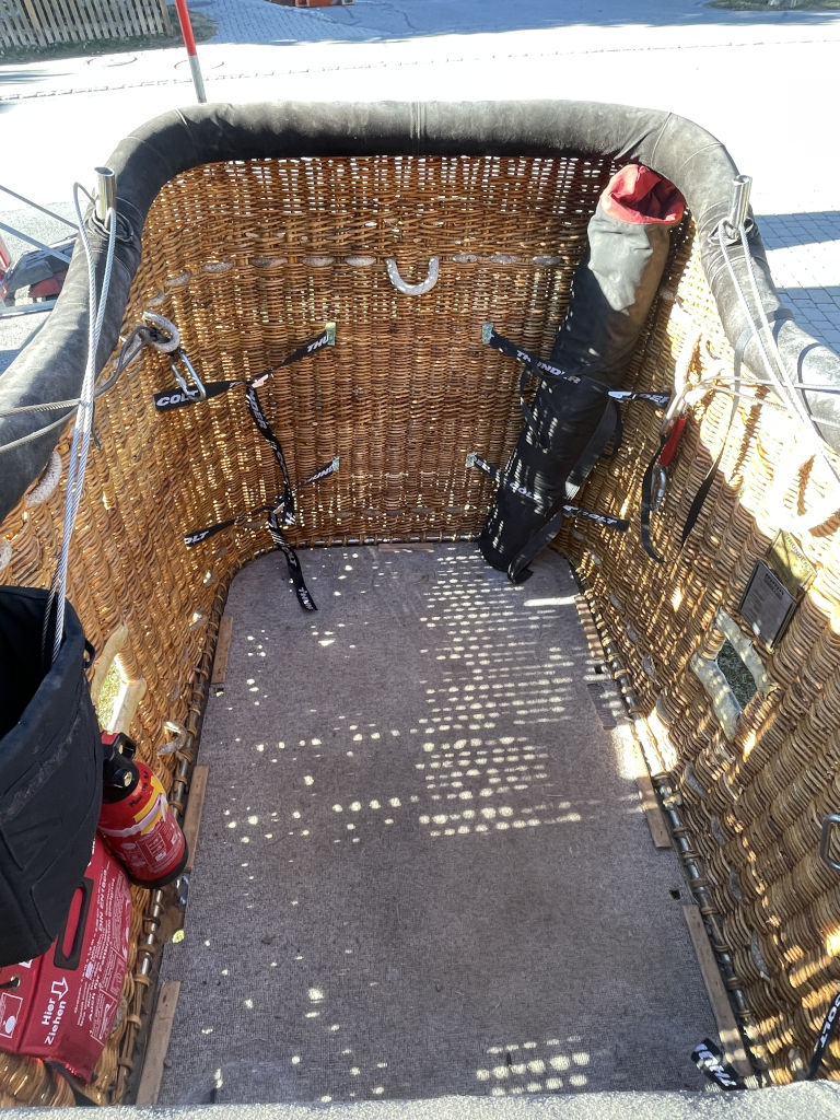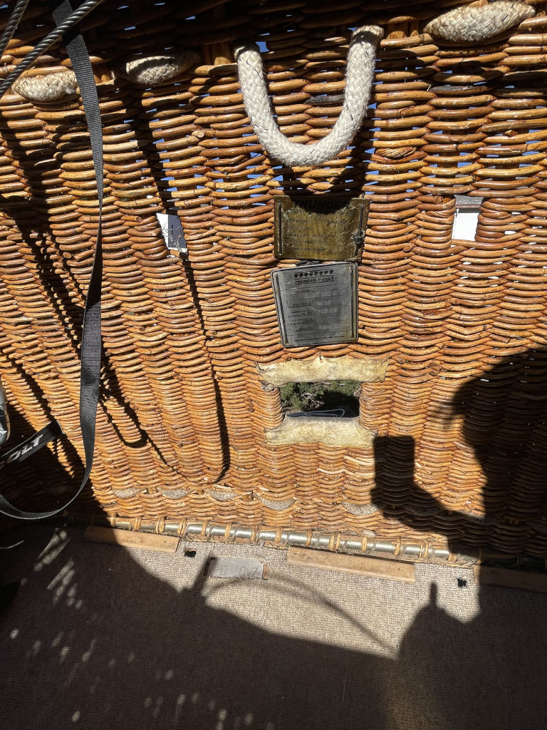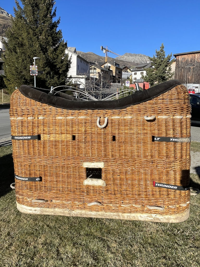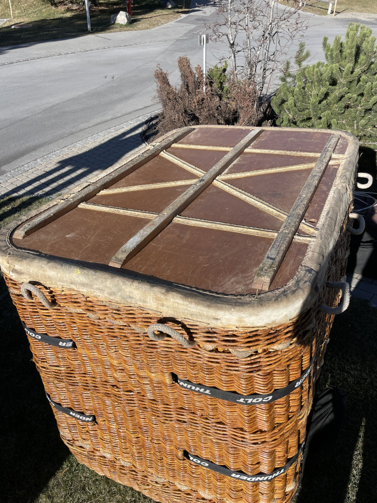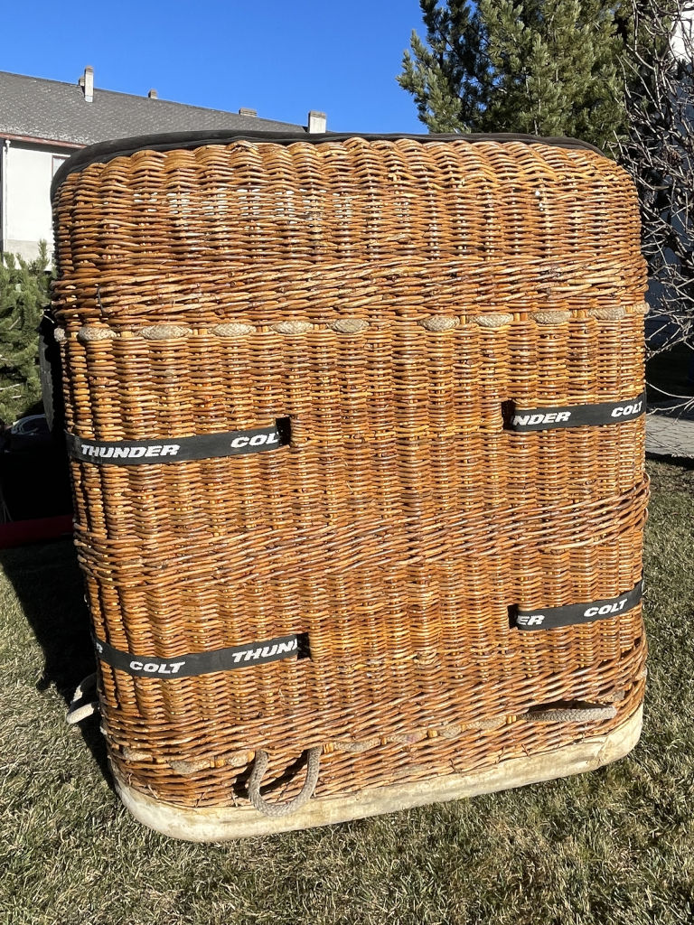 Thunder & Colt basket, built 1992, 1200 hrs. Dimensions 1.83m x 1.22m. Black suede top rim, cushion floor. In good shape.