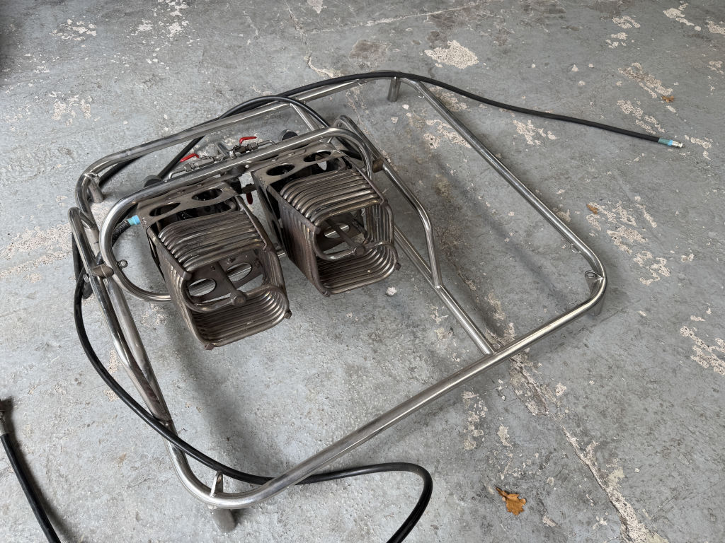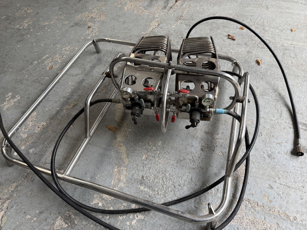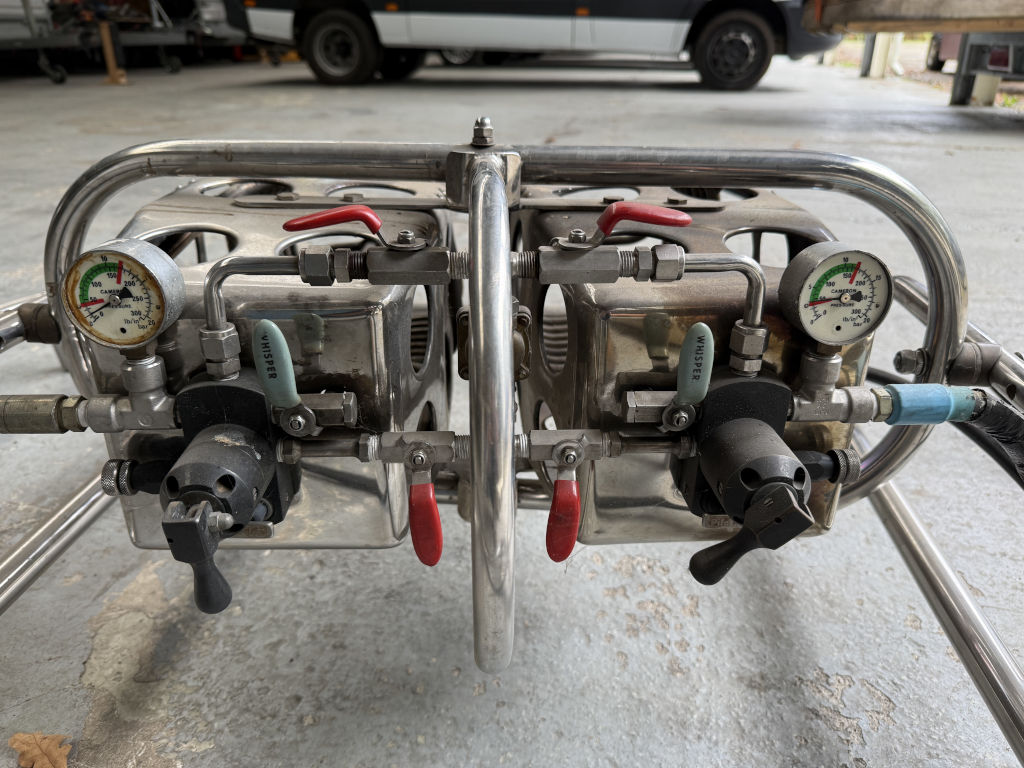 Cameron MK4 Super double burner, built 1993, approximately 800 flights/hrs. Liquid pilot lights, REGO fittings, hoses dated 01/1990. In frame for 140/160 woven floor single T basket. Not flown for more than 15 years. Suitable for rebuild or creative project.