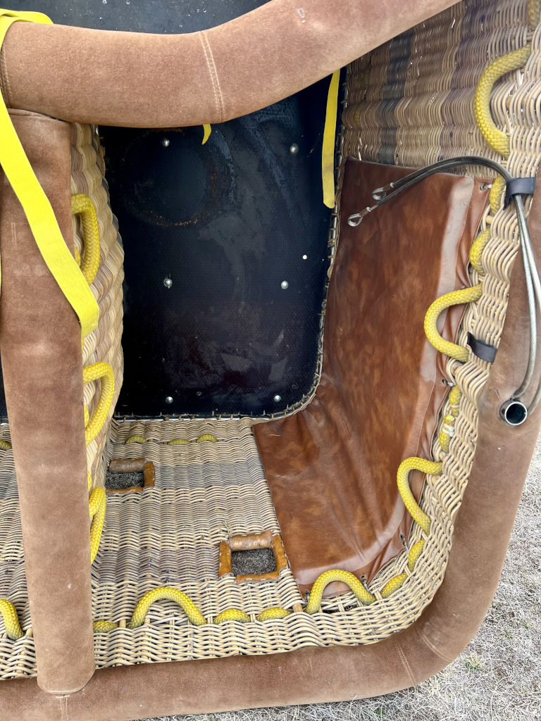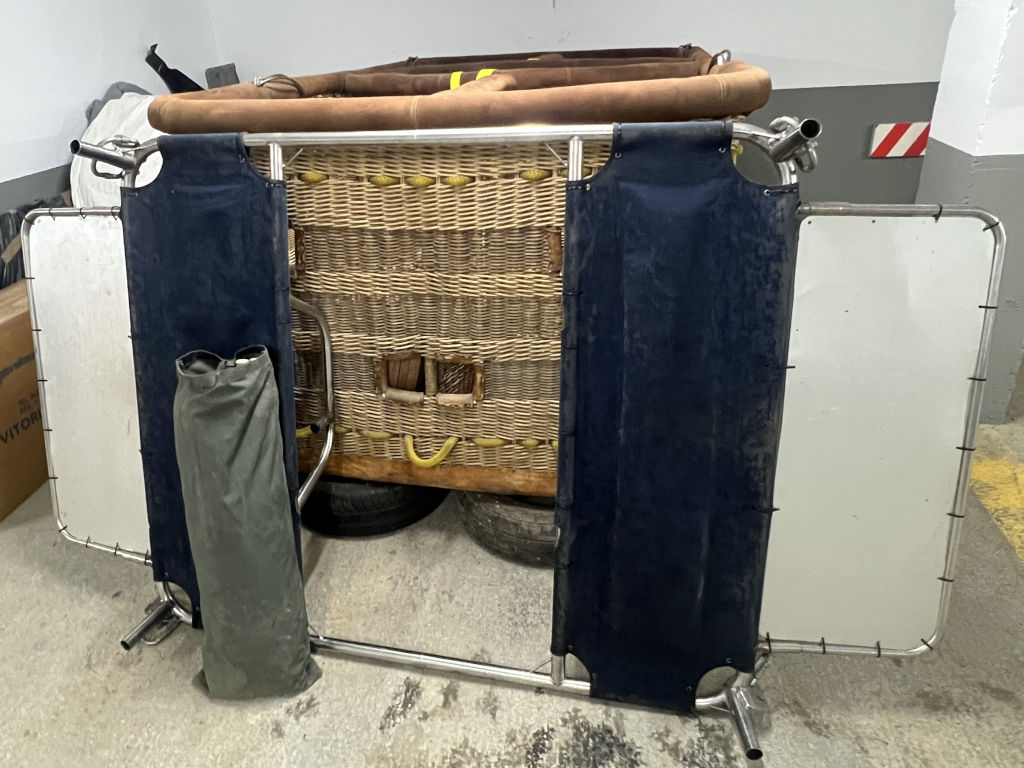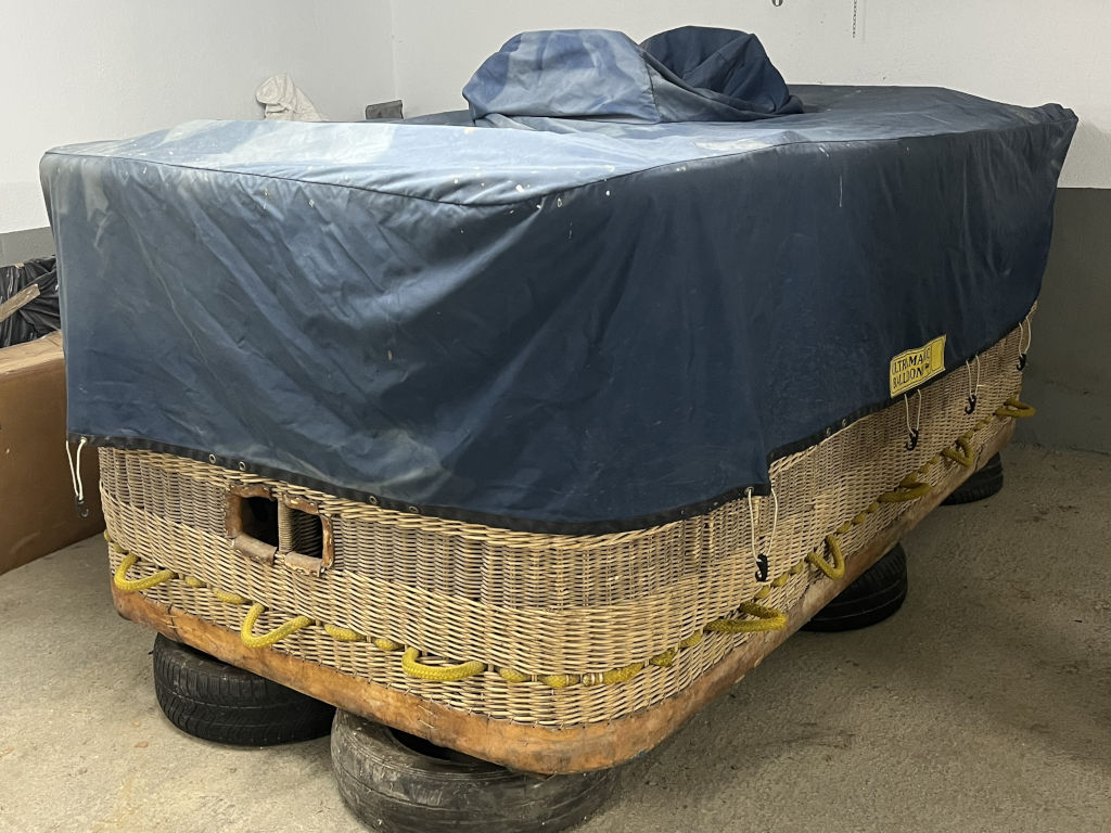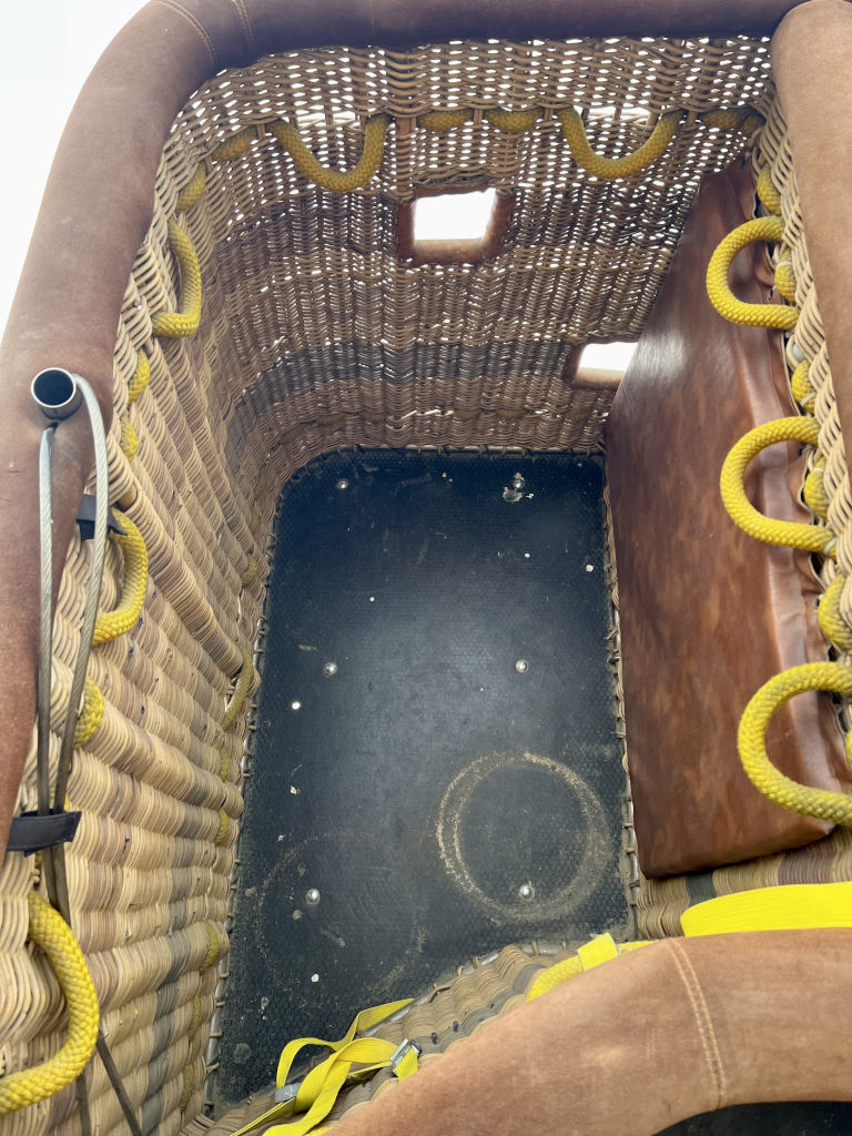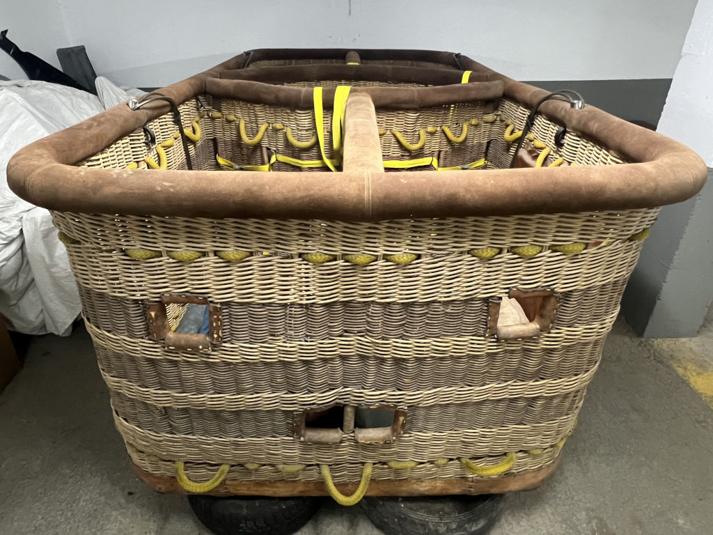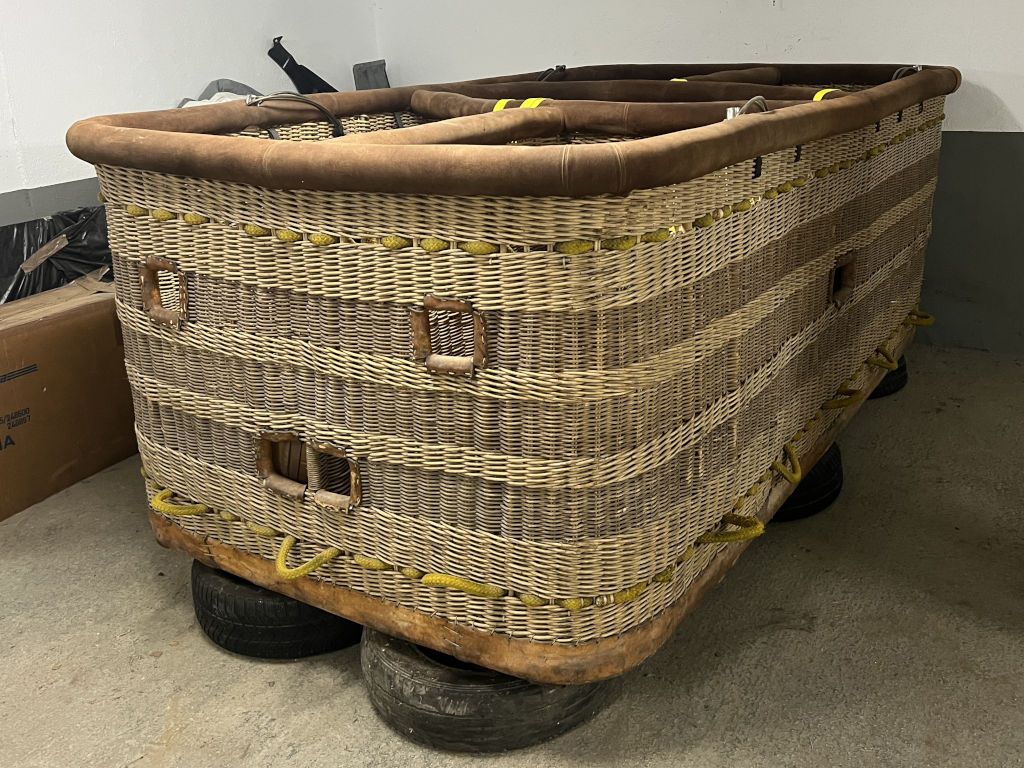 Ultramagic C9 basket, built 01/2000, 270 flights, 300 hrs. Outside dimensions 3.10m x 1.67m x 1.24m. Brown leather top rim, sidewall padding, drop line, anchor for pilot restraint harness, basket cover, burner frame. Not flown since 2010. Stored well. In very good condition.
