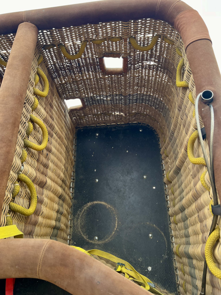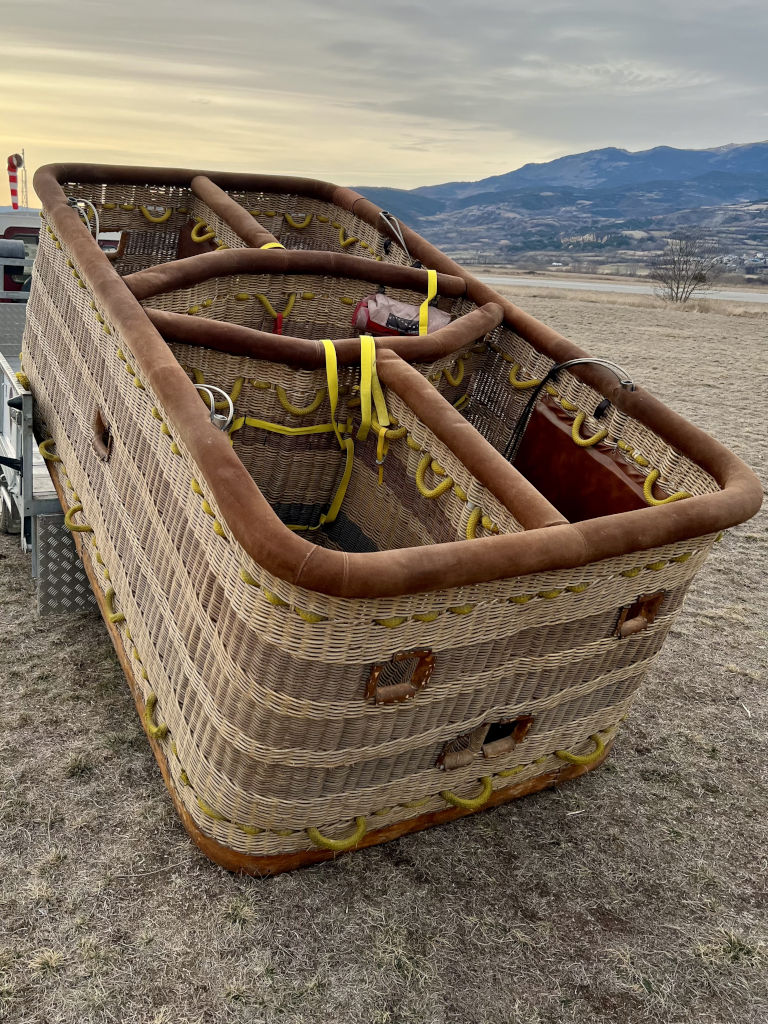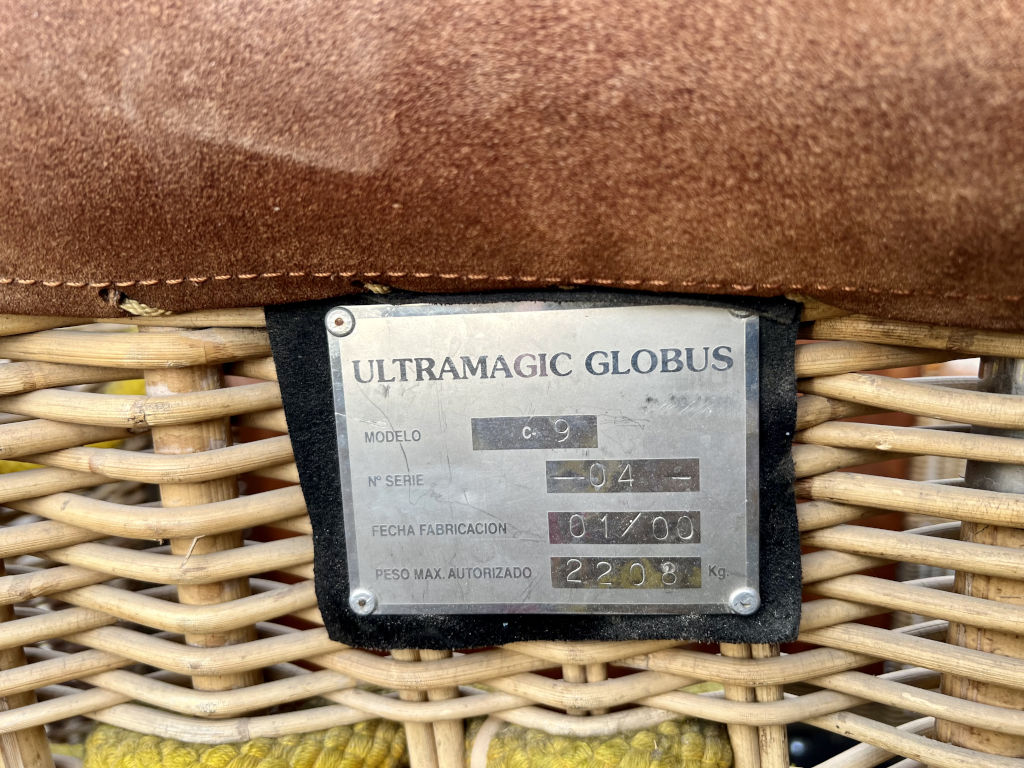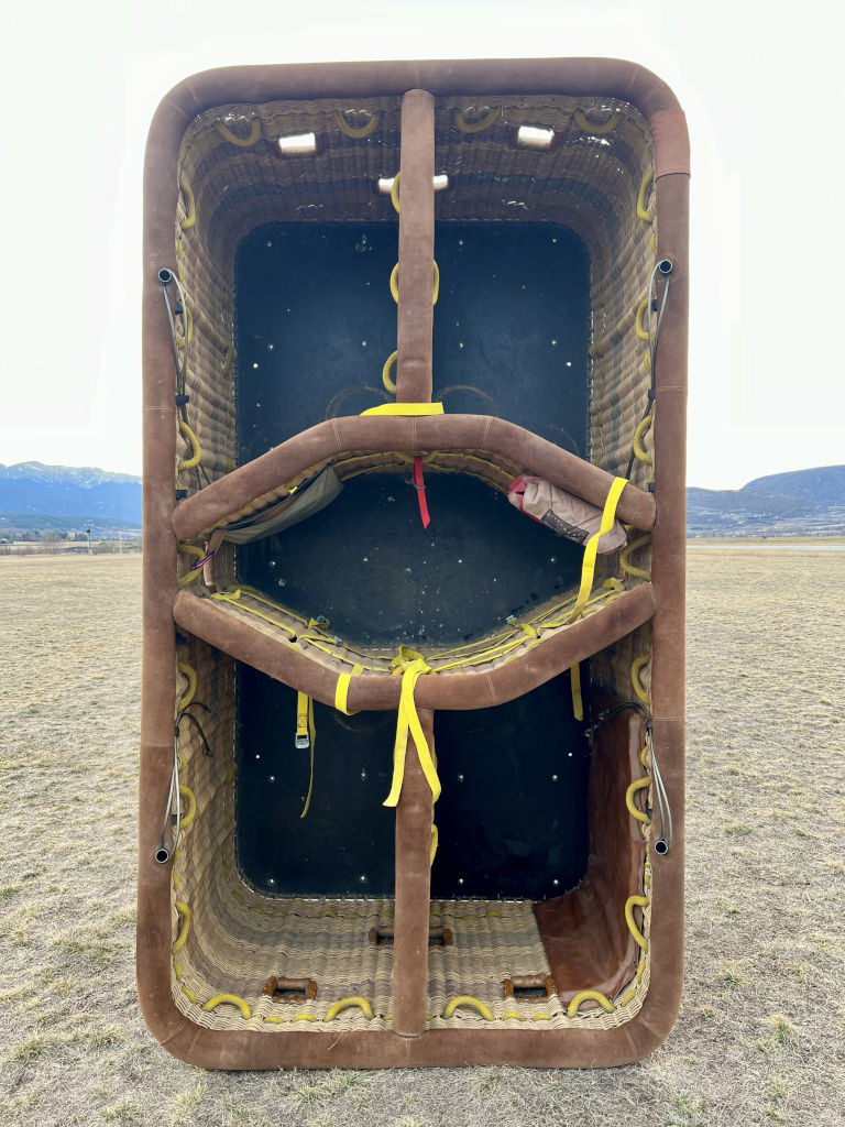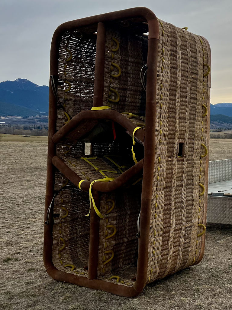 Ultramagic C9 basket, built 01/2000, 270 flights, 300 hrs. Outside dimensions 3.10m x 1.67m x 1.24m. Brown leather top rim, sidewall padding, drop line, anchor for pilot restraint harness, basket cover, burner frame. Not flown since 2010. Stored well. In very good condition.