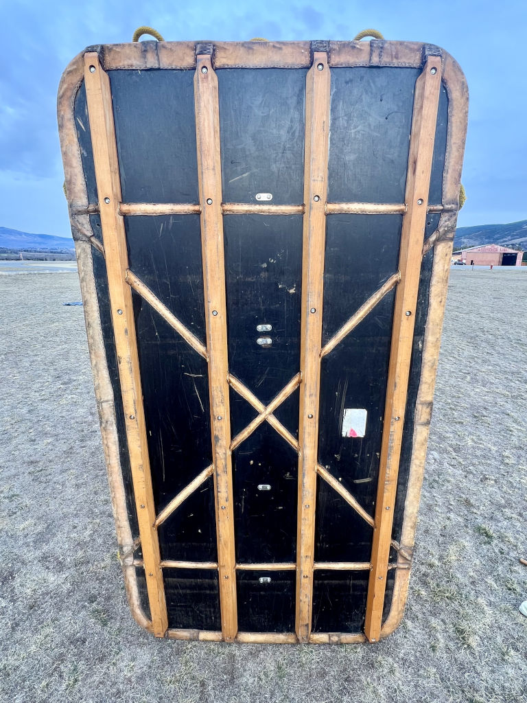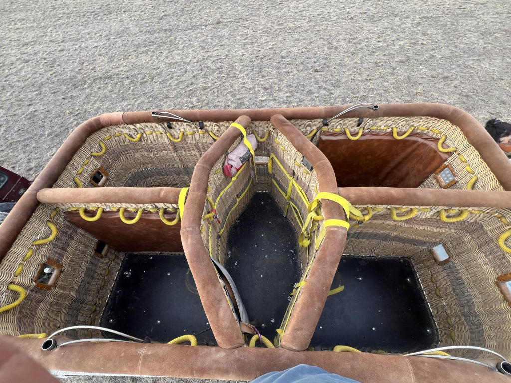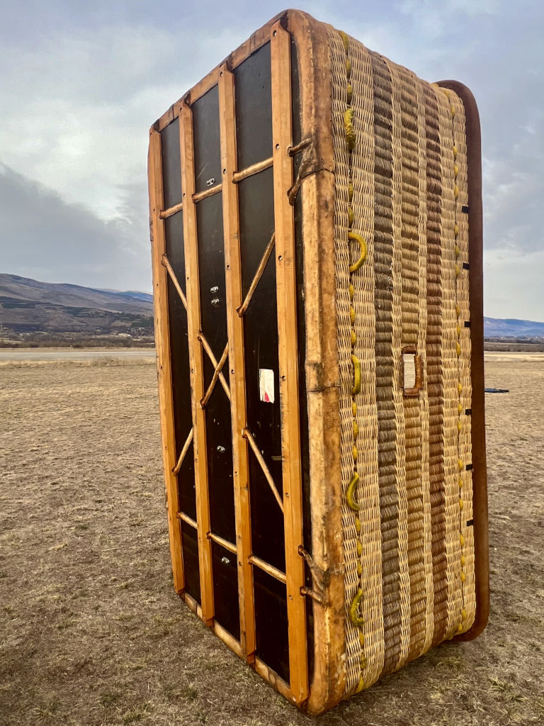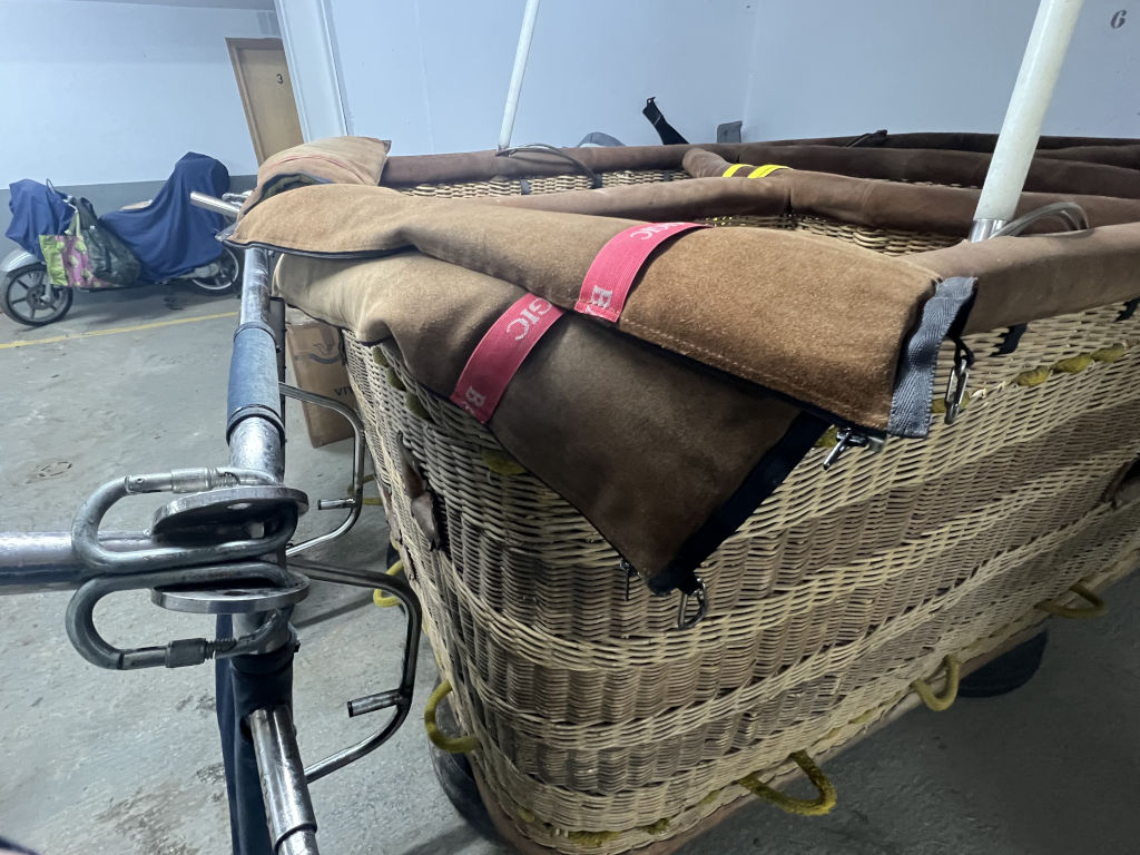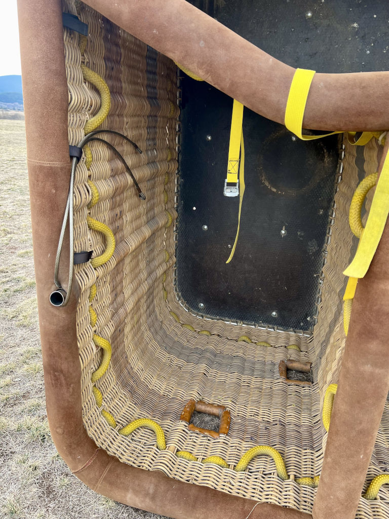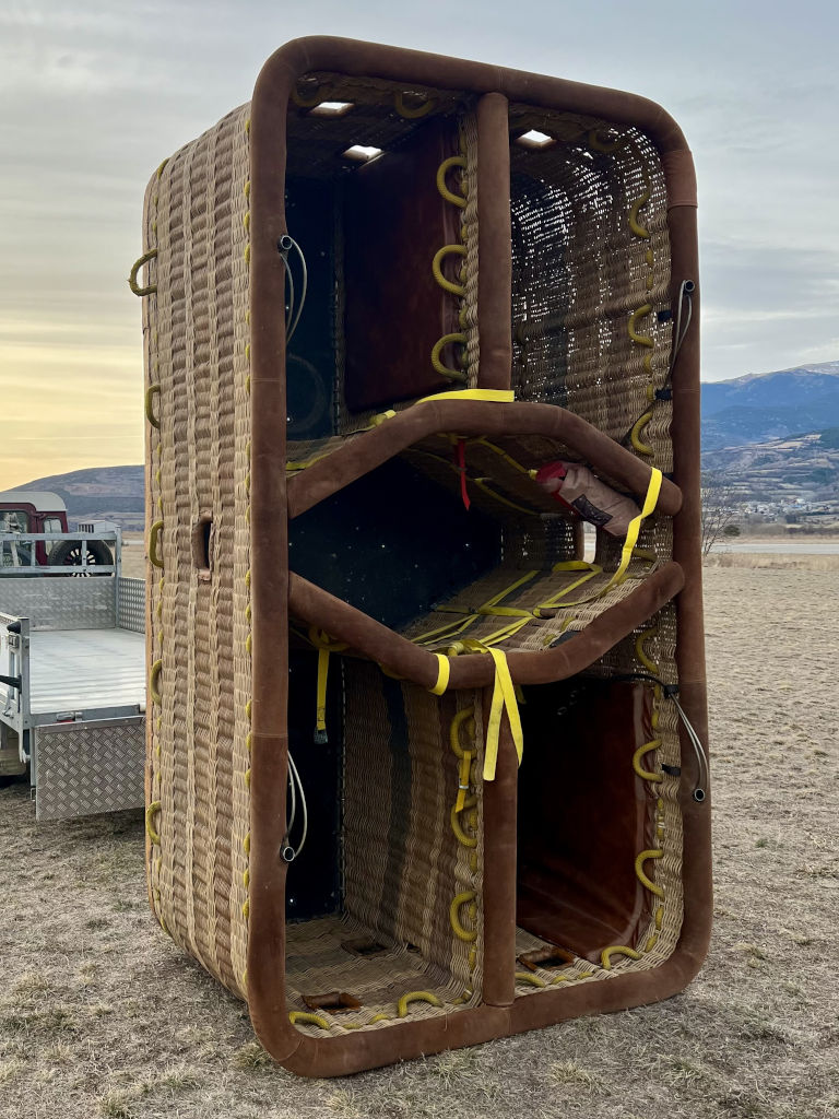 Ultramagic C9 basket, built 01/2000, 270 flights, 300 hrs. Outside dimensions 3.10m x 1.67m x 1.24m. Brown leather top rim, sidewall padding, drop line, anchor for pilot restraint harness, basket cover, burner frame. Not flown since 2010. Stored well. In very good condition.