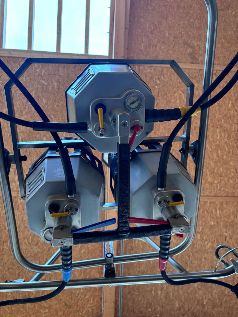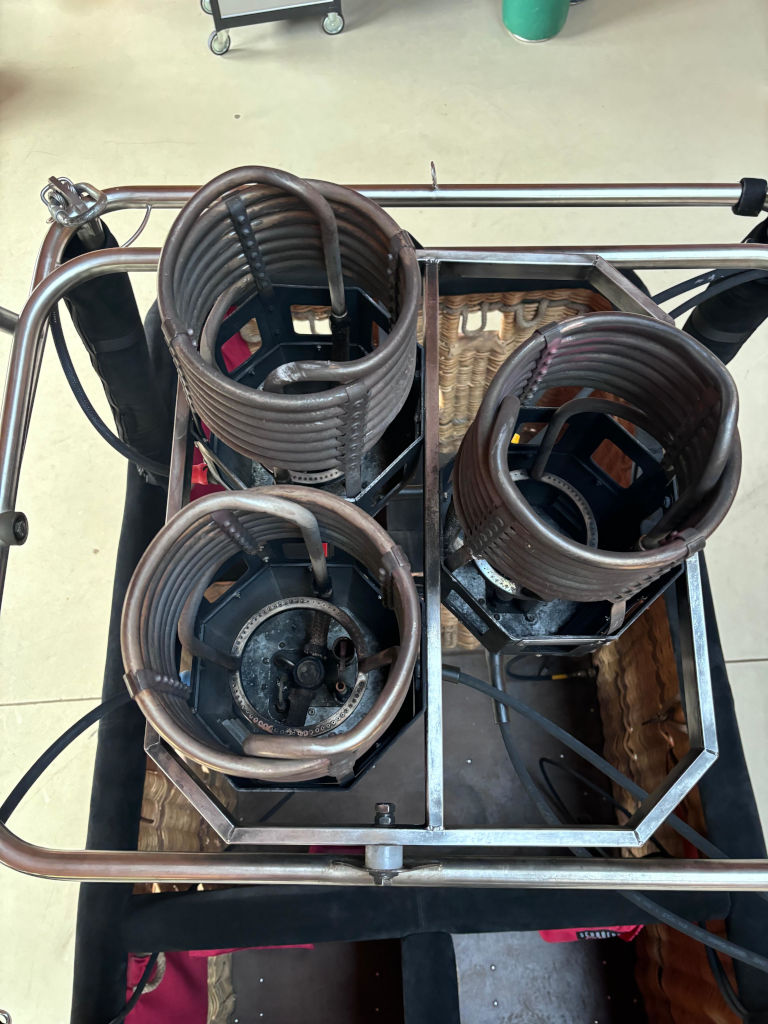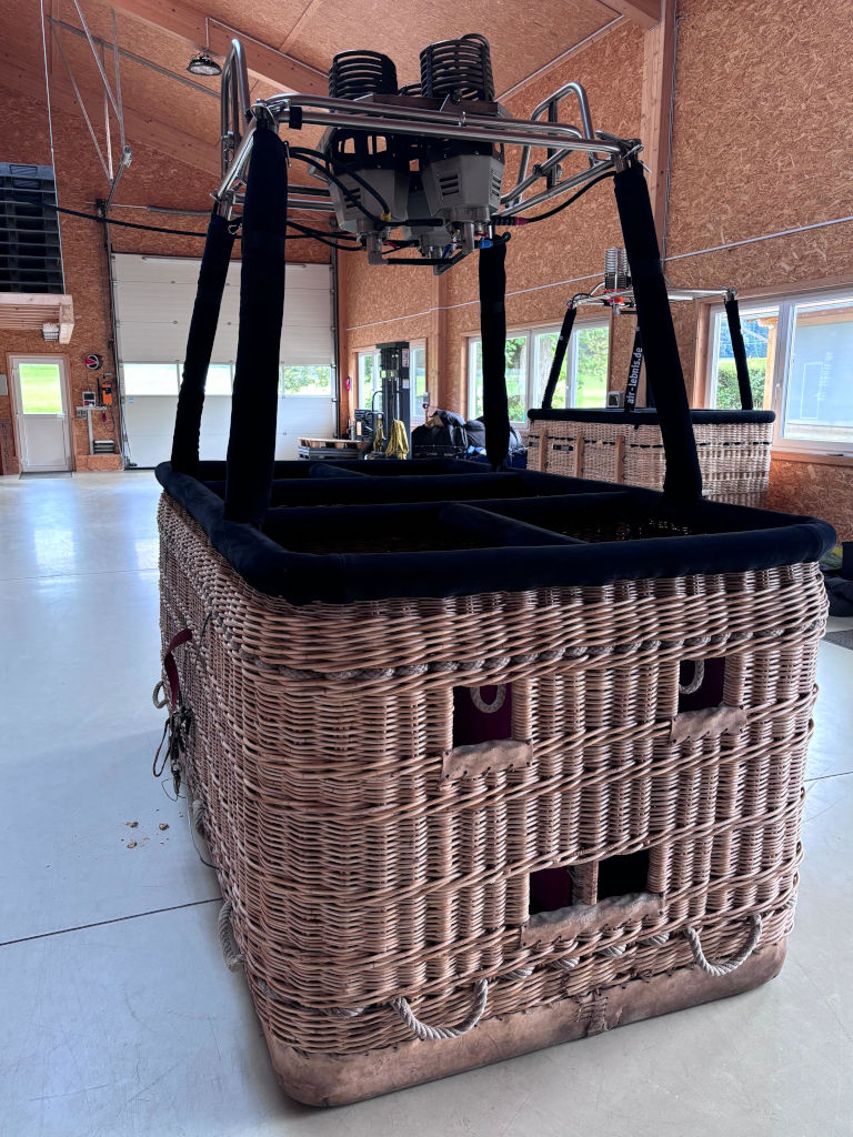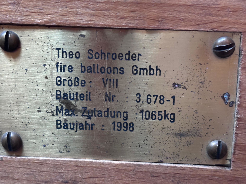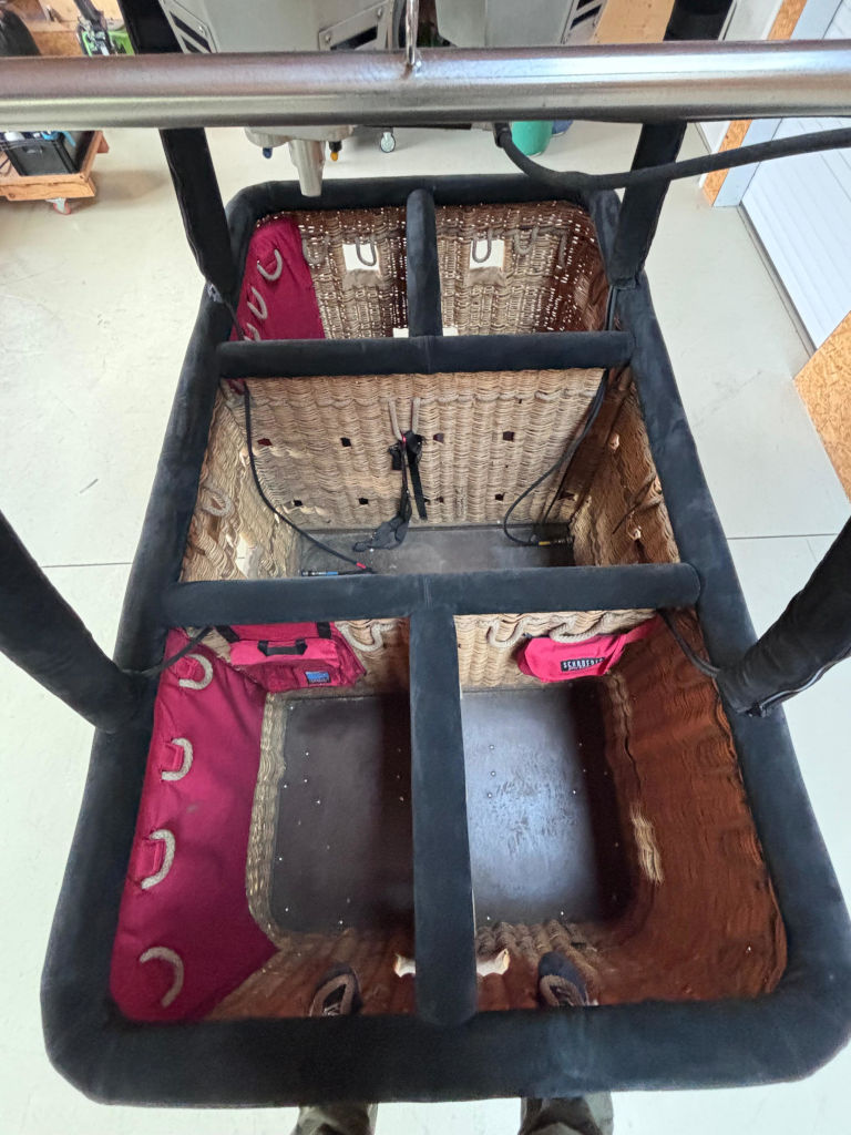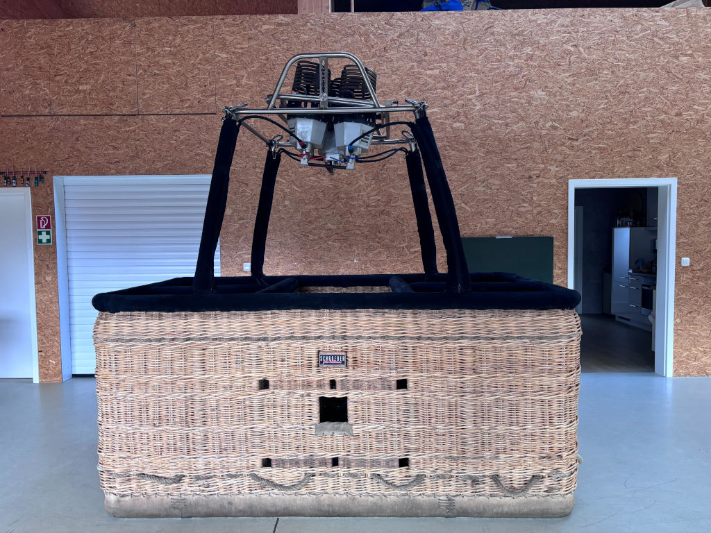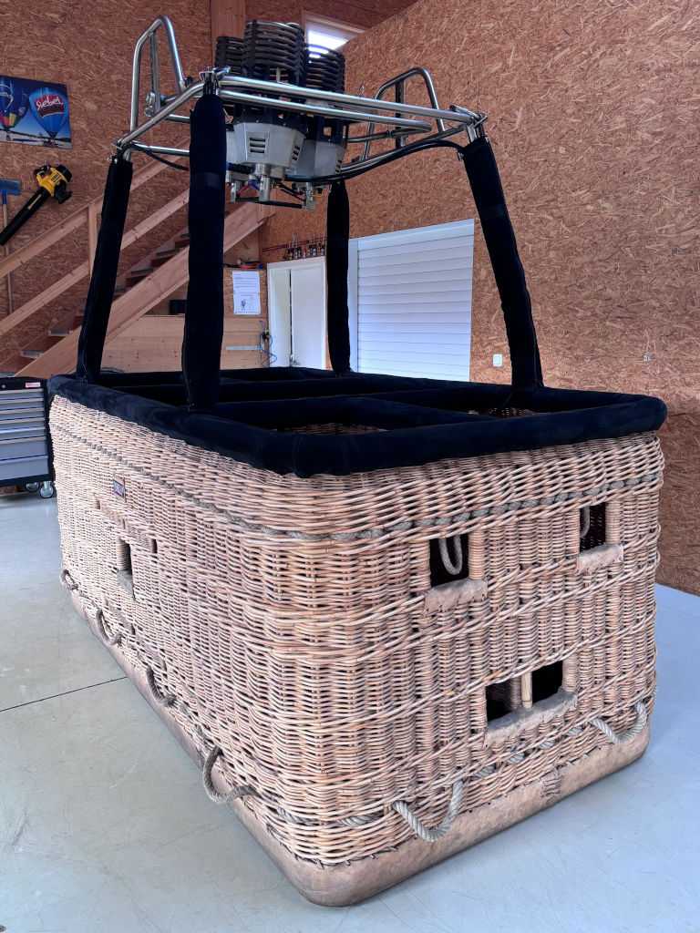 Schroeder VIII/9 basket, built 1998, black suede top rim (new), drop line. Schroeder FB6 triple burner, built 1998, vapour pilot lights, TEMA fittings, hoses dated 05/2019. In height adjustable frame.