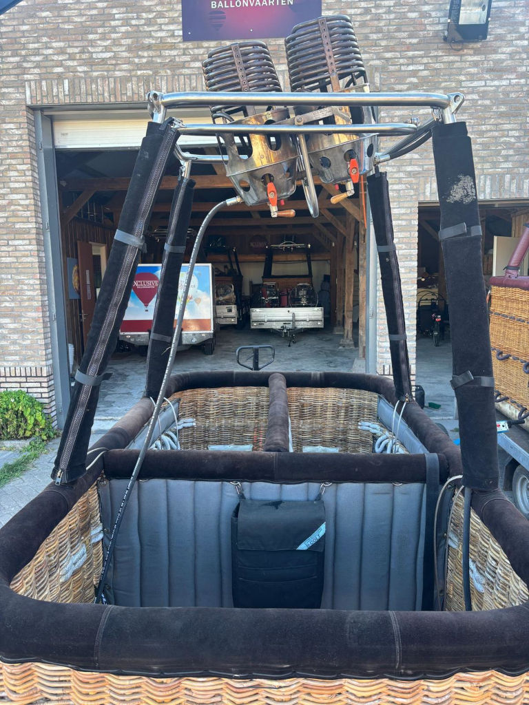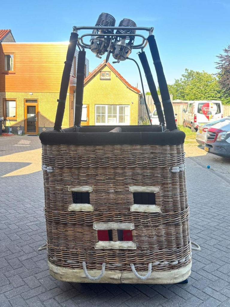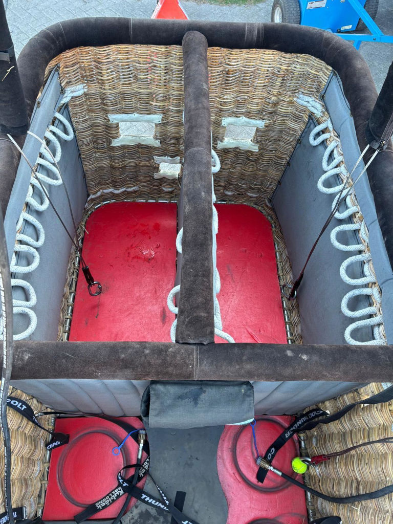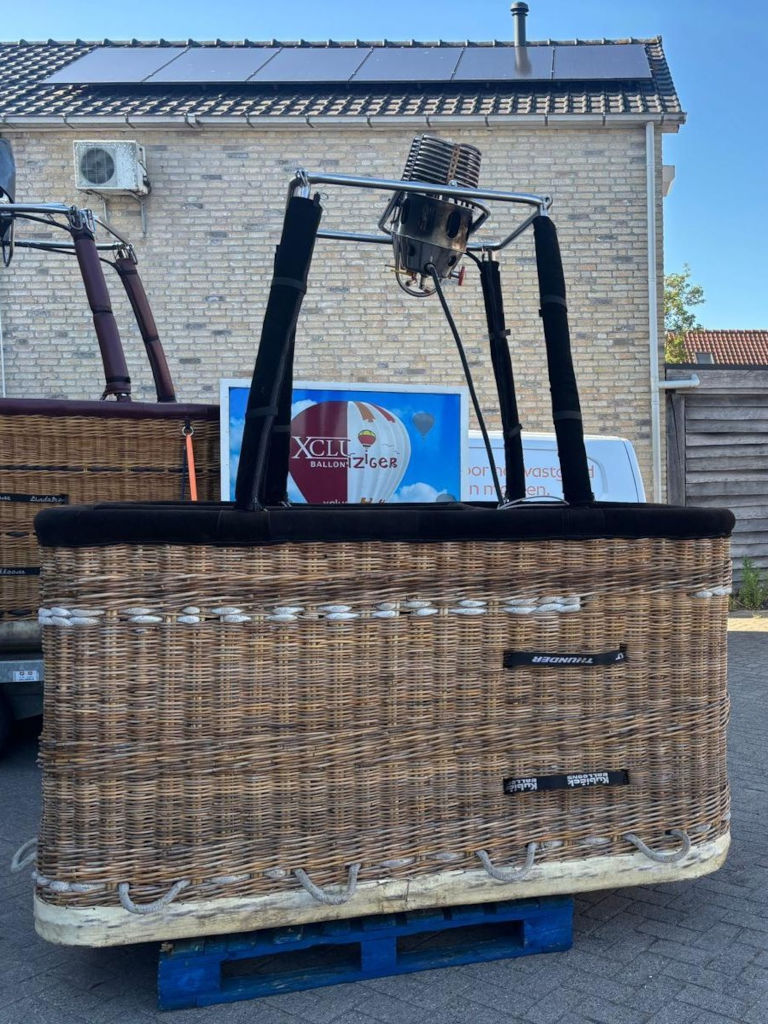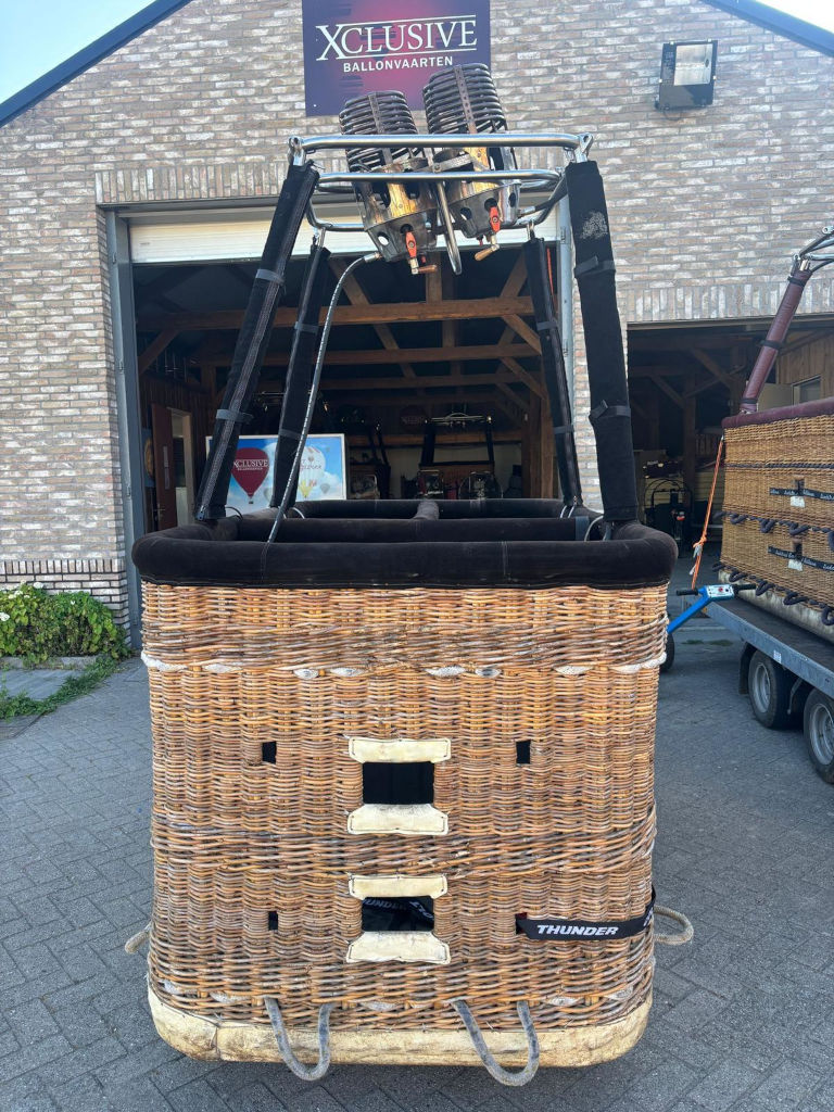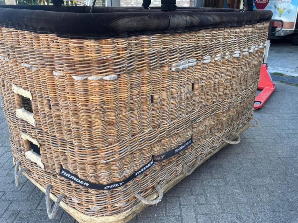 Thunder & Colt single T basket, built 1993, outside dimensions 2.1m x 1.3m x 1.3m. Black suede top rim, sidewall padding, cushion floor. Thunder & Colt C3 double burner, liquid pilot lights, REGO fittings, hoses dated 05/2018.