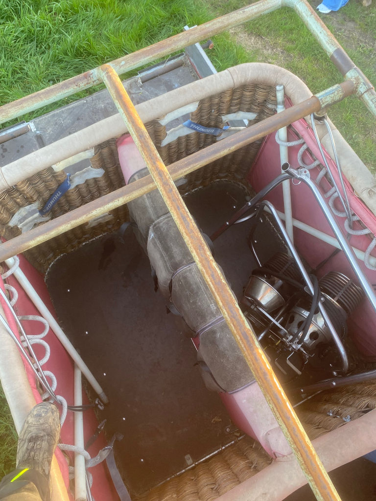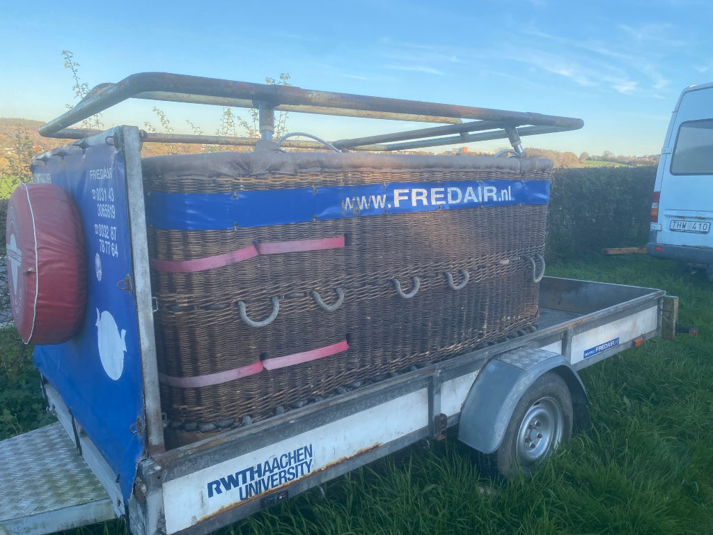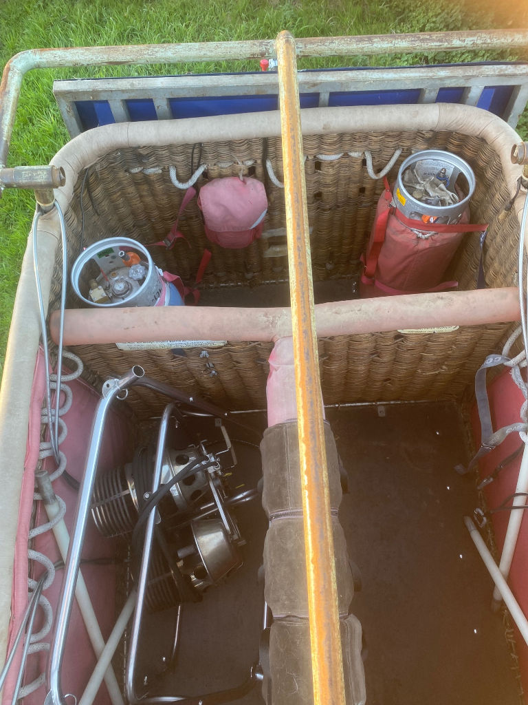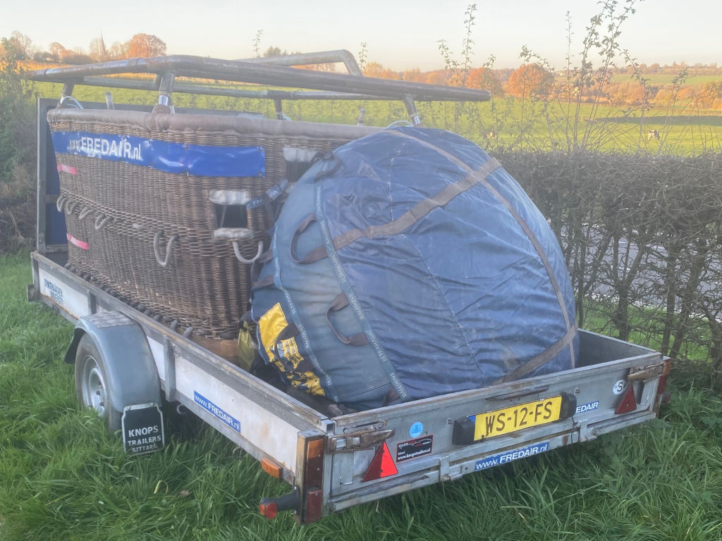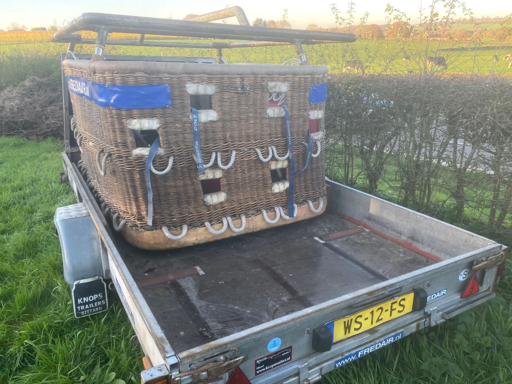 Cameron single T (CB8202) basket, built 1990, 650 flights/hrs. Outside dimensions 2.26m x 1.52m. Brown suede top rim, sidewall padding, pilot restraint anchor. Thunder & Colt MK2 triple + CLF (liquid fire) burner, built 1990, 650 flights/hrs. Vapour pilot lights, TEMA fittings, hoses dated 05-2020 and 04-2022. Fobo 1300SP single axle trailer, built 1988, inside dimensions 3.50m x 1.75m. Max total weight 1300 kg. With PVC cover.