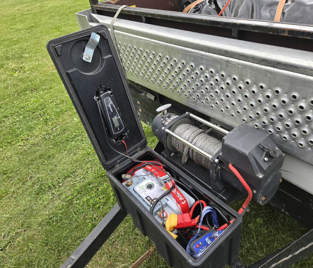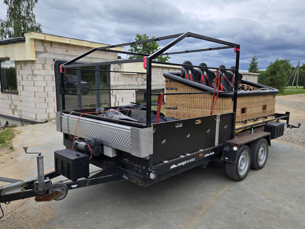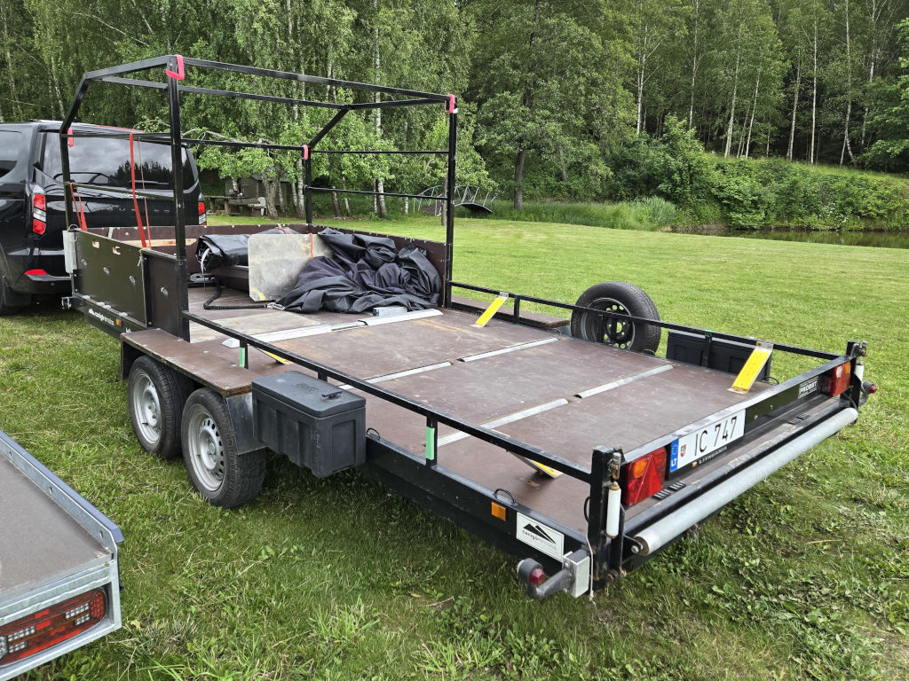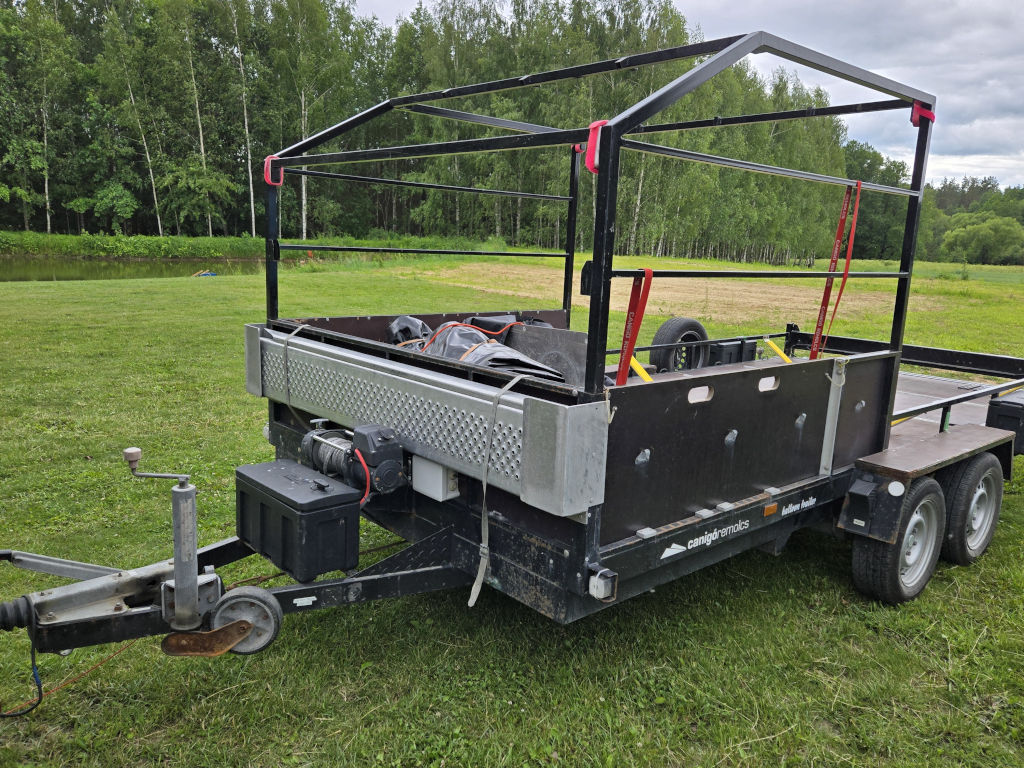 Canigo RC 1500 trailer, built 2012, inside dimensions 4.7m x 2.0m. Max total weight 2200 kg. Electric winch with remote and battery.