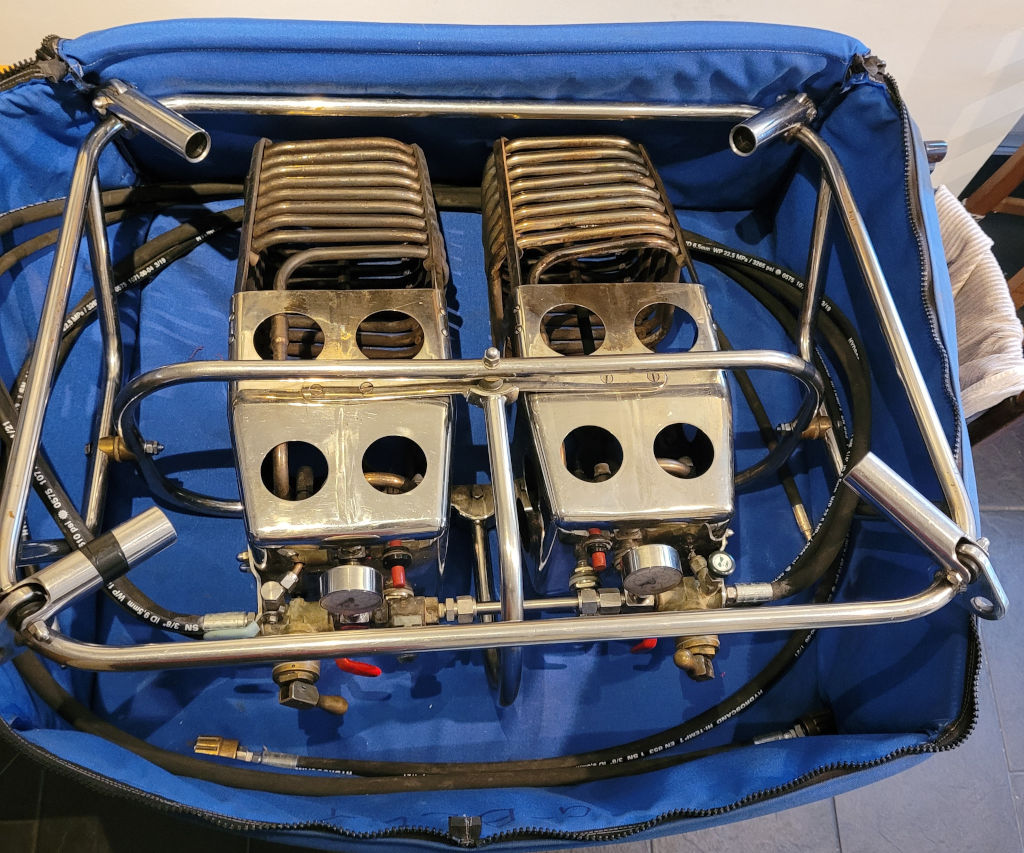 G-HDUO, Ultramagic M-56, built 2011, 147 flights, 127 hrs flown, 1 hr tethered. Hyperlast top (parachute + yellow fabric in top), turning vents. Cameron 56/65 aristocrat basket, built 2000, inside dimensions 1.10m x 0.97m. Inner height 1.1m. Brown suede top rim, cushion floor, fire extinguisher, fire blanket, first aid kit, drop line. Cameorn MK4 double burner, built 2000. Vapour pilot lights, REGO fittings, hoses dated 12/2022. In Kubicek burner bag. Worthington cylinder, master, built 1981, quick shut off valve, REGO fitting, blue cover, PRV/PPT/INT valid until 06/2030. Worthington cylinder, master, built 1986, REGO fitting, blue cover, PRV/PPT/INT valid until 12/2034. Worthington cylinder, slave, built 1978, REGO fitting, blue cover, PRV/PPT/INT valid until 10/2027. Worthington cylinder, slave, built 1982, REGO fitting, red cover, PRV/PPT/INT valid until 10/2027. 5.0 HP inflation fan, stainless steel fixed axle frame, wooden propeller. 2.5m Westfalia single axle trailer, built 2002, inside dimensions 2.5m x 1.05m, max total weight 1.200kg, comes with spare wheel. Bonanno quick release, tether kit. Flytec 3040, refueling hose, manifolds. ARC valid until 28/06/2026, can be sold with new ARC.