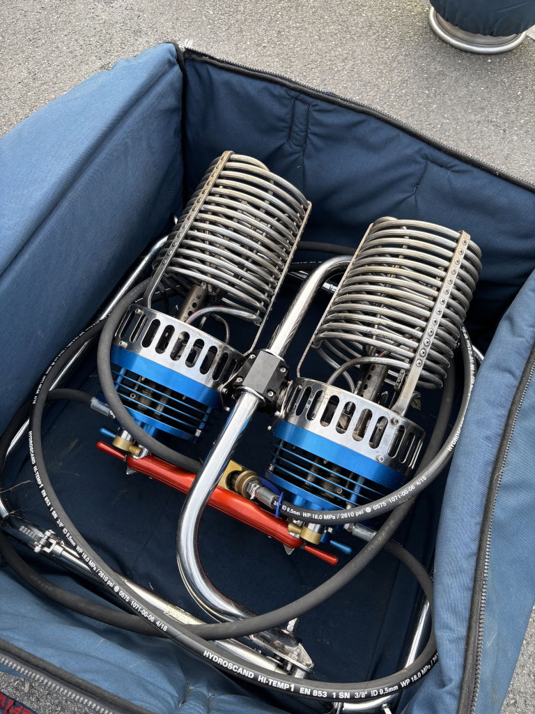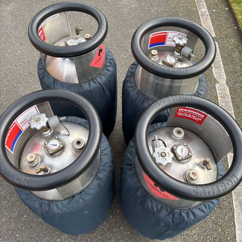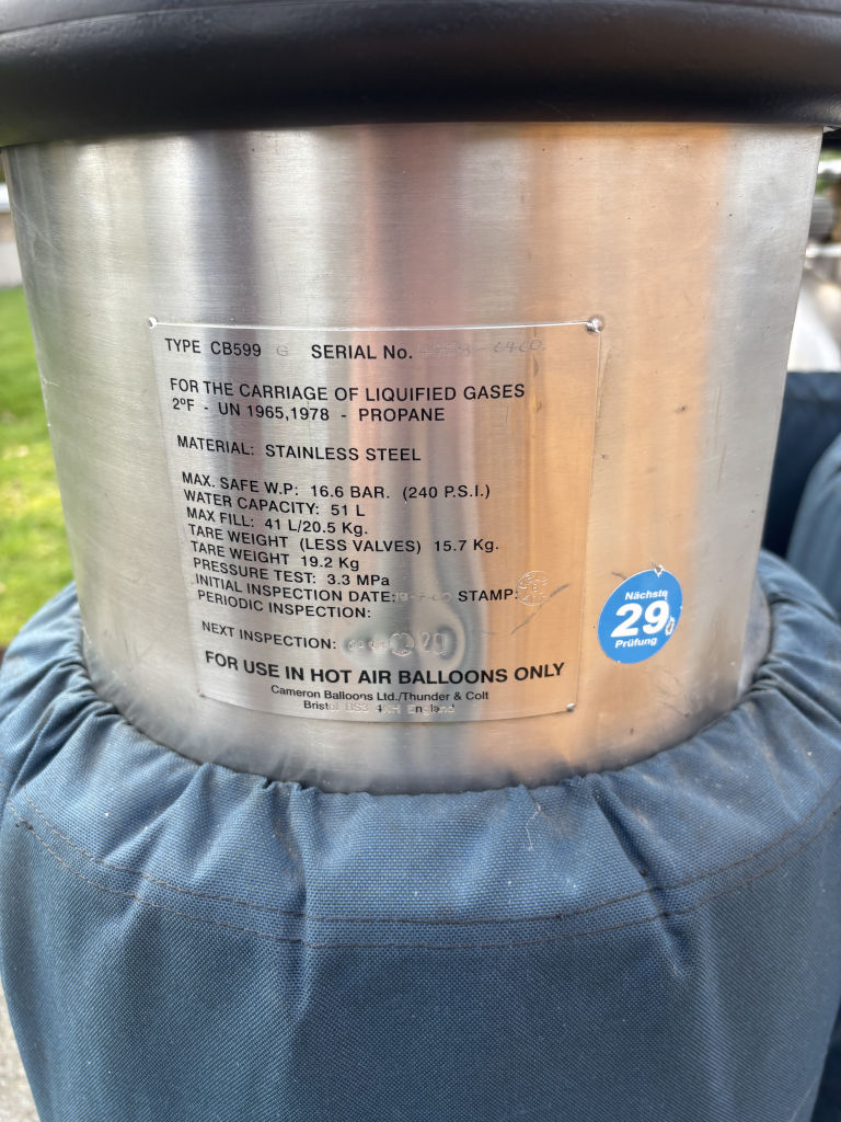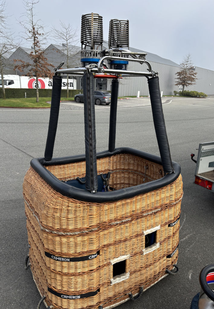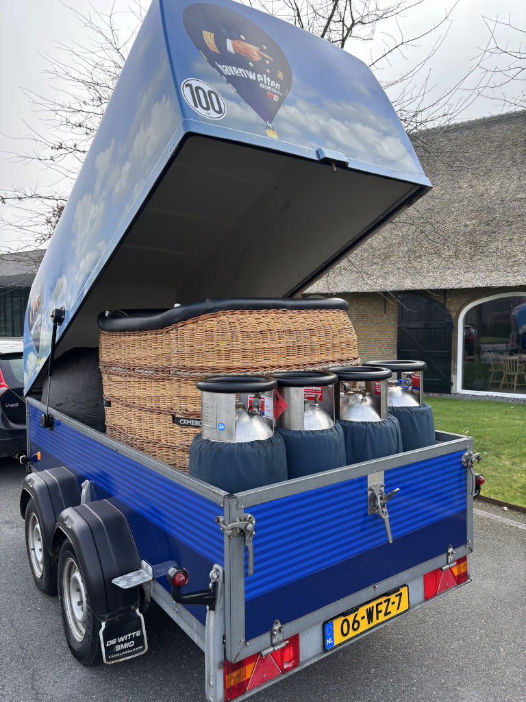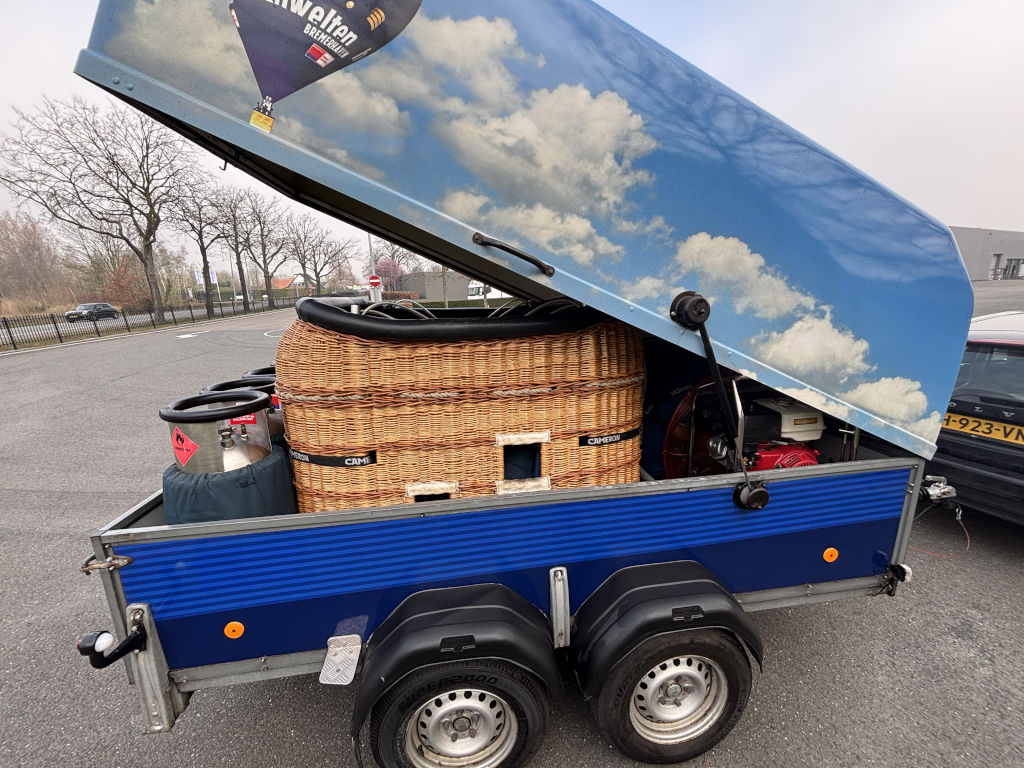 PH-ABJ, Cameron Z-105, built 2008, 201 hrs. Hyperlast top (parachute + 4 rows), smart vent, turning vents. Cameron CB3011-4B basket, built 2000, black leather top rim, sidewall padding, cushion floor, fire extinguisher, drop line, pilot restraint harness, Bonanno quick release. Cameron Sirocco double burner (CB2695), built 2000, liquid pilot lights, REGO fittings, in height adjustable frame. Hoses dated 07/2020. 4x Cameron CB599 cylinder, built 2000, usable volume 41 liter, slave, REGO fitting, blue cover. PRV/PPT/INT valid until 06/2029. 13.0 HP inflation fan, stainless steel flip wheel frame, wooden propeller. Recently serviced. 3.0m Westfalia tandem axle trailer, built 2003, max total weight 2000 kg. Recently serviced. ARC expired, can be sold with new ARC.