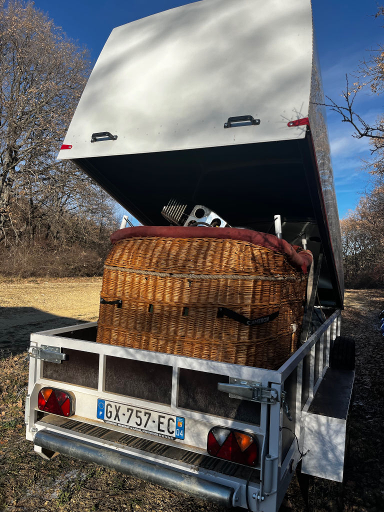 F-HHLO, Cameron Z-90, built 2012, 78 flights, 89 hrs. Full hyperlast, smart vent, turning vents, artwork can easily be removed (sewn only). Cameron CB300-4A basket, outside dimensions 1.47m x 1.07m, red suede top rim, sidewall padding, fire extinguisher, drop line, safety kit, pilot restraint harness. Cameron Shadow double burner, liquid pilot lights, REGO fittings, hoses dated 03/2026. In height adjustable frame. 4x Worthington cylinder, built 1982, 1984, 2x 1985, slave, quick shut off valve, REGO fitting, black cover. PRV/PPT/INT valid until 06/2033. 8.0 HP inflation fan, stainless steel flip wheel frame, wooden propeller. 3.2m Canigo Remolcs tandem axle trailer, built 2024, inside dimensions 3.20m x 1.35m, max total weight 2000 kg. Plywood floor with rollers, heavy jockey wheel, spare wheel, fan bracket, box on front, fire extinguisher in box. Aluminium hood on gas struts. ARC valid until 23/10/2026.